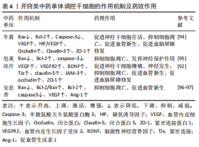 丹参:KIM等[91]发现,中药丹参处理的间充质干细胞治疗后MCAO大鼠脑缺血区域细胞移植存活率约为单纯间充质干细胞移植的2.5倍,且MCAO大鼠脑内p-Akt和p-ERK表达水平显著提高,ERK和Akt磷酸化增强,表明丹参能够促进间充质干细胞在缺血性脑卒中区域的归巢和沉降,有助于间充质干细胞存活。ZHANG等[82]研究证实,①丹参能够增加缺血性脑卒中大鼠脑内神经干/祖细胞从齿状回的颗粒下区到缺血区域的迁移距离,促进神经干/祖细胞归巢;②丹参治疗能够刺激神经祖细胞分化为成熟的神经元并整合到纹状体中现有的神经元回路中;③经丹参处理的Bax和Caspase-3因子表达水平比对照组降低了8.6-12倍,而丹参提取物处理组抗凋亡因子Bcl-2水平比对照组高2.0倍,即丹参能够显著上调抗凋亡因子Bcl-2表达,下调Bax表达,增加Bcl-2/Bax比率,下调缺血性脑卒中促凋亡蛋白Caspase-3和Caspase9表达,抑制缺血性脑卒中急性期神经细胞凋亡,促进神经细胞存活;④丹参治疗14 d,能够刺激缺血性脑卒中模型大鼠神经轴突萌发,并在缺血性纹状体中重建新的轴突连接,进而有助于中风后神经功能的恢复。WEI等[81]发现,丹参治疗能够明显增加局灶性脑缺血小鼠脑组织完全梗死区相关营养因子VEGF、BDNF表达。 川芎:YU等[92]在神经发生的评估中发现,①川芎能够增加MCAO大鼠齿状回和齿状回的颗粒下区两个区域的神经前体细胞和新生神经元数量;②川芎能够增加MCAO大鼠脑组织内BDNF的表达,并且川芎能够减少睫状神经营养因子的表达;③川芎与冰片联合治疗对VEGF的改善明显优于单纯冰片治疗;④补体成分3(complement component 3,C3)和pentraxin3(PTX3)分别被广泛用作星形胶质细胞从A1表型到A2表型的标志物,缺血性损伤能够诱导齿状回和齿状回的颗粒下区中C3的增加[93]。川芎能够降低C3表达,而且增强两个区域的PTX3表达,有效逆转缺血性损伤时反应性星形胶质细胞从A1表型到A2表型过程,抑制星形胶质细胞分化。 (2)开窍类中药单体:见表4。"