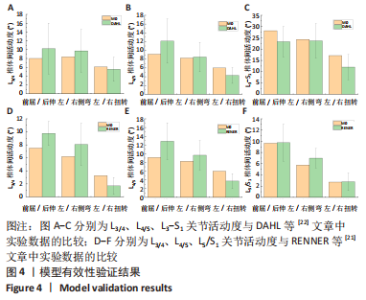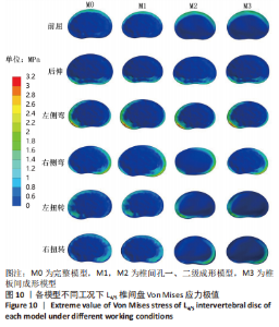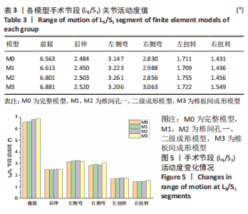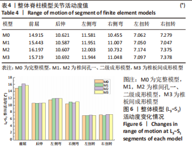 2.2 各组模型手术节段(L5/S1)和整体脊柱模型关节活动度值比较 在400 N垂直向下力和8 N?m力矩载荷下,由表3和图5可观察到,在手术节段(L5/S1)关节处,椎间孔一级成形模型M1在前屈、后伸、左侧弯、右侧弯、左扭转和右扭转工况下的L5/S1段关节活动度均值较模型M0分别增加了0.76%,-1.39%,2.41%,3.80%,-0.08%,0.36%;椎间孔二级成形模型M2在前屈、后伸、左侧弯、右侧弯、左扭转和右扭转工况下的L5/S1段关节活动度均值较模型M0分别增加了3.63%,-0.76%,3.61%,0.90%,2.62%,1.73%,椎板间成形模型M3在前屈、后伸、左侧弯、右侧弯、左扭转和右扭转工况下较模型M0分别增加4.84%,1.44%,1.86%,8.23%,0.64%,8.26%。"