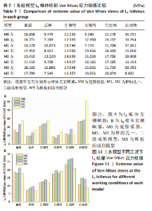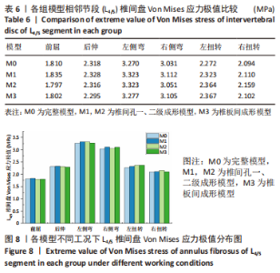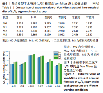 一级椎间孔成形术对脊柱手术节段和整体脊柱的活动度变化影响较小,活动度变化百分比均低于5%;二级椎间孔成形在手术节段活动度变化不明显,整体活动度在前屈时轻度增加;椎板间成形术的手术节段右侧弯和右扭转的活动度轻度增加,整体模型关节活动度在前屈和右侧弯时轻度增加,整体腰骶模型及各节段之间维持稳定状态。 2.3 各组模型手术节段(L5/S1)椎间盘和相邻节段(L4/5)椎间盘Von Mises 应力极值比较 由表5和图7可见,在手术节段(L5/S1),椎间孔一、二级成形模型M1和M2中椎间盘Von Mises 应力极值在前屈、后伸、左侧弯、右侧弯、左扭转和右扭转时分别较M0模型增加1.88%,6.06%,1.07%,3.14%,4.57%,3.13%和11.06%,12.50%,2.84%,5.50%,18.32%,15.48%;椎板间成形模型M3在前屈、后伸、左侧弯、右侧弯、左扭转和右扭转时分别较M0模型增加12.22%,19.54%,5.75%,7.34%,10.05%,9.97%。"