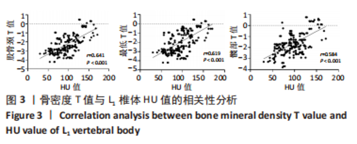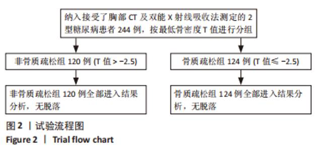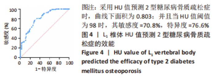 RESULTS AND CONCLUSION: (1) There was no significant difference in sex, age, body mass index, glycosylated hemoglobin, mean blood glucose, calcium (Ca), phosphorus (P), time of type 2 diabetes mellitus, history of hypertension and history of hyperlipidemia between the two groups (P > 0.05). (2) The HU value was positively correlated with the lowest T value of the hip (r=0.619, P < 0.01); the HU value was positively correlated with the hip T value (r=0.584, P < 0.01), and the HU value was positively correlated with the femoral neck T value (r=0.641, P < 0.01). When the HU value was 98, the prediction of type 2 diabetes mellitus osteoporosis had good accuracy, and the sensitivity was 70.8%. (3) It is concluded that the HU value of the lumbar 1 vertebra based on chest CT examination is of good value for osteoporosis screening in patients with type 2 diabetes mellitus, and may be an opportunistic and cost-free supplementary screening method for type 2 diabetes mellitus osteoporosis.