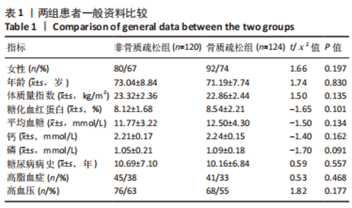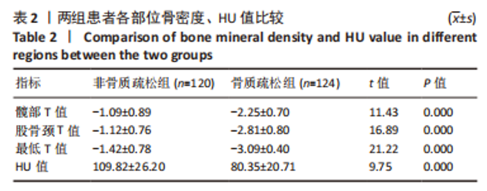 METHODS: The clinical data of 244 patients with type 2 diabetes mellitus treated in the First Affiliated Hospital of Chengdu Medical College from June 2020 to June 2022 were analyzed retrospectively. The bone mineral density was obtained by dual-energy X-ray absorptiometry. According to WHO’s diagnostic criteria for osteoporosis, the subjects were divided into the non-osteoporosis group (n=120) and the osteoporosis group (n=124). The general condition, T value and HU value of lumbar 1 vertebra in chest CT were compared, and the relationship between the HU value and T value of each position was analyzed and the accuracy of type 2 diabetes mellitus osteoporosis was evaluated.