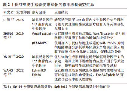 YU等[21]在缺氧条件下培养内皮祖细胞和ST2细胞,使用siRNA和缺氧诱导因子1抑制剂干扰缺氧诱导因子1,然后检测血管内皮生长因子和促红细胞生成素的变化。结果表明,在缺氧环境下,缺氧诱导因子1α/血管内皮生长因子通路的所有因子均上调;随着缺氧诱导因子1的抑制或干扰,血管内皮生长因子在蛋白质和mRNA水平上的表达均降低,而促红细胞生成素的mRNA表达从干预后6 h开始下降,从干预后12 h开始在蛋白质水平上发生显著变化。综上,促红细胞生成素可通过诱导缺氧诱导因子1的表达,继而上调下游血管内皮生长因子等关键因子,影响血管生成和成骨的生物学过程。 2.2.3 p38 MAPK信号通路 丝裂原活化蛋白激酶(mitogen-activited protein kinases,MAPK)信号通路是介导细胞外信号到细胞内反应的重要信号转导通路,与细胞的增殖、分化和凋亡等许多重要的生命活动密切相关,可被多种刺激如生长因子、神经递质、激素、细胞应激和细胞因子等所活化。p38是MAPKs家族的一员,可以由细胞因子和环境理化压力的刺激下被激活,参与多种生物学活动,如肿瘤发生、成骨、成软骨分化等。在参与间充质干细胞的成骨分化方面,已有的研究都提示其与成骨细胞活性密切相关,还与成骨细胞的其他分化标记物相关。大量文献报道,p38 MAPK在干细胞成骨分化中也发挥着关键作用,且能够通过多种途径调节骨代谢,是干细胞成骨效应中重要的效应感受器。丁月峰等[51]的研究中发现体外抑制p38信号通路(抑制p38的磷酸化)会抑制上颌突间充质细胞的增殖和成骨分化,提示p38可能参与了MAKA信号通路调控的颅颌面骨骼发育。ZHENG等[47]的研究证实,促红细胞生成素可以活化p38 MAPK信号通路,增加p38和GSK3β磷酸化,在使用p38 MAPK抑制剂后,p38及GSK3β磷酸化受到阻滞,成骨相关因子水平明显下降;加入促红细胞生成素后,能够部分逆转糖基化终末产物引起的牙周膜干细胞骨向分化能力减弱,促进成骨分化,说明p38 MAPK信号通路可能也参与了促红细胞生成素的促进成骨作用。 2.2.4 EphrinB2/EphB4信号通路 在骨重塑过程中,破骨细胞和成骨细胞之间可通过直接接触(如配体和受体结合),也能通过间接接触(如分泌旁分泌因子或转录因子与细胞或骨基质等相互作用)。近年来有研究表明,破骨细胞表面也存在相关因子能作用于成骨细胞,并调控成骨细胞的分化[52-53]。EphrinB2/EphB4信号通路见图4。"