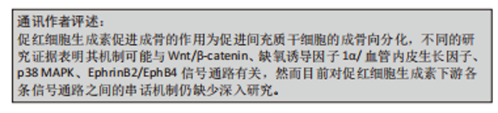 2.1 促红细胞生成素与骨代谢之间的关系 骨是一种动态器官,具有高度再生的潜能,生理性骨代谢和重建是一个持续终生的动态过程[22]。间充质干细胞是一种来源于中胚层的多能干细胞,从各种组织中分离出来,包括骨髓、子宫内膜、牙髓、经血和脂肪组织等,具有易获取、易培养、低免疫原性和易于转染外源基因并长期表达的特点,也具有向成骨细胞、破骨细胞、脂肪细胞、神经细胞和基质细胞分化的能力[23]。当缺损发生时,间充质干细胞被招募到缺陷区[24],通过成骨细胞和破骨细胞的耦合活动进行持续不断的重塑,用新骨取代旧骨,并修复骨缺损,以维持骨组织结构和功能的完整性,是骨组织再生的关键。 促红细胞生成素对成骨有着重要的促进作用,大量不同动物模型的体内研究都显示外源性促红细胞生成素的应用可以提高成骨效果,促进骨缺损的修复。在鼠的股骨缺损模型中,促红细胞生成素增加了新生骨的体积和生物力学性能[25-26],在鼠的颅骨缺损模型中也观察到了类似的结果[24]。无论是新生还是成年小鼠,全身应用剂量为6 000 U/kg的促红细胞生成素都可以诱导骨形成。在兔的脊柱融合模型中,每日应用250 U/kg 促红细胞生成素连续皮下注射,20 d后可以观察到明显的成骨[27]。在猪的颅骨缺损模型中,促红细胞生成素的治疗也可以明显增强骨愈合[28-29]。HOLSTEIN等[30]第一次报道将促红细胞生成素短时间应用于大鼠骨折时对骨折愈合的促进效果。目前研究认为,促红细胞生成素在骨折愈合中的作用主要包括增加骨的体积和矿化程度、加速骨折断端连接以及增强骨的生物力学性能[31-32]。 与上述促红细胞生成素的促进成骨作用相反,促红细胞生成素对骨代谢的影响还体现在破骨活动中。SINGBRANT等[33]观察到大剂量 (300 U/kg)的促红细胞生成素应用会导致骨小梁体积减少,并伴有骨的重建活动活跃,而用双膦酸盐抑制破骨细胞活性后,大剂量促红细胞生成素引起的骨量减少也受到了抑制,表明破骨细胞可能是造成这种作用的原因。此外,一些其他研究也观察到外源性促红细胞生成素的应用可能会引起类似的骨量减少的现象[34-35]。此外,在构建的促红细胞生成素过表达的转基因小鼠模型中,也观察到了骨吸收速率增加、成骨速率降低和骨量减少的现象[35-37]。有体外实验表明促红细胞生成素可以直接刺激破骨细胞分化为成熟的破骨细胞,破骨细胞的分化导致促红细胞生成素R的转录水平相应降低,说明促红细胞生成素R的表达仅限于不成熟的破骨细胞,而促红细胞生成素对破骨细胞的刺激作用可能与JAK2和PI3K信号通路有关[35,38]。"