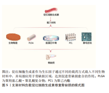 2.3 促红细胞生成素在骨组织工程中的应用 经典的骨组织工程包括种子细胞、支架材料和生长因子。促红细胞生成素作为在骨代谢过程中具有重要应用潜力和价值的生长因子,其在骨组织工程中的应用也逐渐受到不同研究者的关注[56-60]。 2.3.1 促红细胞生成素与支架材料 骨组织工程的支架材料可分为天然生物和人工合成两种。已有研究中,负载促红细胞生成素的人工合成支架材料包括聚己内酯(Polycaprolactone,PCL)、聚羟基乙酸-聚乳酸复合物(poly(lactic-co-glycolic acid),PLGA)、生物陶瓷、纳米纤维、脱蛋白牛骨(deproteinized bovine bone,DBB)和明胶微球等。天然生物支架材料包括胶原凝胶及壳聚糖等,促红细胞生成素与各种支架材料结合参与构建新型的组织工程骨,进而修复不同尺寸和部位的骨缺损,支架材料负载促红细胞生成素修复骨缺损的模式图,见图5。"