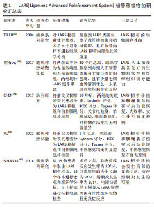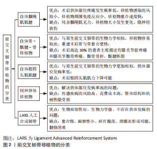 随着减少软组织剥离技术的发展,自体股四头肌腱逐渐表现出和原生前交叉韧带在生物力学上更高的相似性,在前交叉韧带重建后可以提供更加强健和稳定的结构[35]。有人进行了股四头肌移植和自体腘绳肌移植的术后2年效果对比,发现两者在术后的主观结局、膝关节稳定性和再次手术率方面没有差异[36],此外,股四头肌移植的供区发病率较低,但可能发生股四头肌肌力不足。但是,有研究者表明股四头肌移植不会造成术后的股四头肌肌力下降[37]。BARIé等[38]对比了股四头肌移植和骨-髌腱-骨移植的术后10年疗效,总结出两者的术后功能评分、关节松弛度、隧道的增宽均无显著差异,另外,股四头肌移植具有供区发病率低的优点。股四头肌肌腱的优缺点见图2。 近几年,随着新型材料及合成技术的飞速发展,人工合成移植物逐渐引起人们的兴趣,尤其用聚对酞酸乙二酯材料合成的LARS韧带(Ligament Advanced Reinforcement System)已经广泛应用于临床。TRIEB等[39]在2004年首次对使用LARS韧带重建的患者取样本,通过组织学观察到,6个月后成纤维细胞通过构建囊膜黏附于LARS韧带周围,且LARS韧带上有血管向内生长和结缔组织包绕。翟昕元等[40]也通过动物实验表明了LARS有超高的生物相容性,韧带周围无炎症反应。有研究者进行了一项长达10年的对照研究,发现LARS韧带移植和自体腘绳肌移植在术后功能评分、安全性和失败率方面无差异[41]。同样,XU等[42]通过一项前瞻性研究,对比了LARS韧带移植和自体腘绳肌移植的效果,发现这两种移植技术在术后的功能评分和本体感觉恢复方面无差异。但是有一项研究质疑了LARS韧带的强度,怀疑磨损掉落的碎片可能会导致滑膜炎形成,影响关节功能,增加翻修率[43]。虽然LARS韧带在生物相容性和生物力学方面有明显的优势,然而人工合成移植物同样存在愈合慢、弹性小、耐磨性小及翻修困难等缺点[44]。LARE韧带的优缺点,见图2。LARS韧带移植物的研究汇总,见表1。"