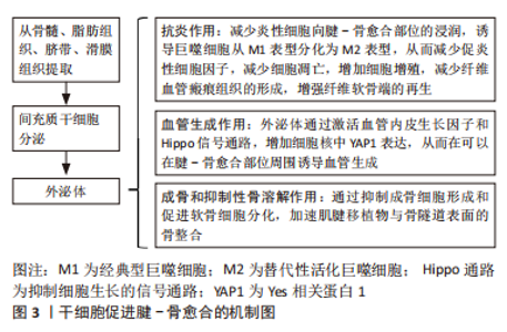 总之,在如今的前交叉韧带移植物选择中,自体腘绳肌肌腱是前交叉韧带移植物的首要选择;骨-髌腱-骨移植物由于其供体部位发病率高的缺点,常被作为第二选择;同种异体移植物存在花费成本高、传播疾病和生物力学受损的问题,当自体肌腱无法使用时,才会选择同种异体移植物;股四头肌肌腱因为剥离技术有限,经常导致供体部位肌力下降,近几年剥离技术提高,股四头肌肌腱可以作为移植物的备选;虽然LARS韧带在生物相容性和生物力学方面都比较优秀,但是由于价格昂贵、术后并发症多等原因而当做移植物的备用选择之一。医疗技术在发展,股四头肌肌腱和人工韧带在将来会更加完美。 2.5 促进移植物愈合的方法 移植物愈合过程分为移植物的退变、增殖、韧带化三个阶段,第一阶段:移植物的成纤维细胞坏死,细胞数量急剧减少,产生细胞因子和趋化因子,发生炎症反应,持续约4周;第二阶段:术后4-12周出现移植物的细胞活性升高和细胞外基质变化,以细胞增殖和胶原基质的再吸收为特征,通过移植物血管化,沉积新的胶原,再进行生化和组织学修饰,最后重塑移植物和重建血管;第三阶段:术后12周,移植物进行自适应重塑,达到原生前交叉韧带的生物力学性能和结构,逐渐韧带化[45]。 2.5.1 缝合带加强 是在前交叉韧带断裂并发旋转不稳定的情况下,进行前交叉韧带重建联合前外侧复合体加强术。YOO等[46]研究表明,与孤立前交叉韧带重建相比,联合缝合带加强可以增强移植物的稳定性,使患者可以更快地恢复活动。HAMIDO等[47]也发现,与孤立前交叉韧带重建相比,联合前外侧复合体加强可以降低膝关节旋转不稳定性和器械性膝关节松弛度,提高术后功能评分。可见,缝合带加强可以增加膝关节稳定性,保证移植物的愈合。 2.5.2 干细胞疗法 干细胞自身具有超强的自我更新能力、长期生存能力和多向分化潜能[48],在促进移植物愈合及再生领域逐渐引起人们注意。干细胞的来源有很多种,包括胚胎干细胞、脂肪组织来源干细胞、骨髓来源间充质干细胞等。在促进移植物愈合方面,最常被研究的是骨髓来源间充质干细胞,这种干细胞一般从手术过程中的骨髓里面提取,在生长因子、机械刺激、生物材料等分化诱导剂的作用下,朝着韧带、纤维软骨和骨的方向分化,并通过旁分泌途径调节炎症,促进移植物再生[49]。 有研究者探索了骨髓来源干细胞的旁分泌机制,通过自身分泌的生长因子、细胞因子和外泌体,调节移植物愈合部位的分子成分,从而有抗凋亡、抗瘢痕形成、促进血管生成和免疫调节的功能,进而达到促进肌腱愈合的目的[50]。LIM等[51]在一项动物模型实验中,将骨髓来源间充质干细胞植入实验组模型的腱-骨愈合界面,和空白组对照发现,实验组模型的腱-骨愈合界面有大量软骨生成,空白组则是瘢痕组织。也有对于脂肪来源干细胞可用性的研究,一项实验发现,和骨髓来源间充质干细胞相比,应用了脂肪组织来源干细胞的模型发生异位骨化的风险和免疫原性均低[52]。然而最近的一项研究对脂肪来源干细胞的作用发出了质疑,这项研究将受试者分为脂肪来源干细胞干预组和空白组,结果提示两组在术后12个月的膝关节功能改善程度和移植物的愈合速率方面无明显差异[53]。为了验证脂肪来源干细胞的有效性,FRANKLIN等[54]发明了肌腱衍生水凝胶,对老鼠模型分别使用肌腱衍生水凝胶和生理盐水,干预1周后两组均给予皮下注射脂肪来源干细胞,结果发现使用了肌腱衍生水凝胶的模型在肌腱愈合程度方面明显优于空白组,通过流式细胞技术证实肌腱衍生水凝胶通过吸引干细胞的归巢促进肌腱愈合。因此,干细胞可以为促进移植物愈合提供新的研究方向,但需要更加先进的技术支持。间充质干细胞促进腱-骨愈合机制图,见图3。"