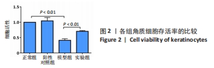 2.1.2 各组角质细胞凋亡情况 流式细胞术检测结果显示,正常组、阳性对照组、模型组与实验组的细胞凋亡率分别为(6.87±0.27)%,(6.25±0.32)%,(38.50±0.16)%,(23.89±0.23)%,见图3A。与正常组相比,肿瘤坏死因子α干预的角质细胞发生明显凋亡(P < 0.05);与模型组比较,实验组细胞凋亡率明显降低(P < 0.05)。 为了进一步确认枸杞多糖能够抑制肿瘤坏死因子α介导角质细胞的凋亡作用,利用Western blot检测细胞凋亡蛋白Cleaved caspase-8、TNF R1、FADD的蛋白水平,结果见图3B、C。与正常组比较,阳性对照组细胞内Cleaved caspase-8、TNF R1、FADD的蛋白表达均无明显变化(P > 0.05),模型组细胞内Cleaved caspase-8、TNF R1、FADD的蛋白表达均升高(P < 0.01);与模型组比较,实验组细胞内Cleaved caspase-8、TNF R1、FADD的蛋白表达均降低(P < 0.01)。"