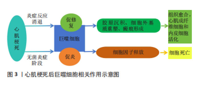 后的心肌组织修复是机体免疫防御作用的效应。巨噬细胞做为机体中最具吞噬作用的一类先天免疫细胞,当组织受伤时,在其固有的免疫中发挥着显著防御作用[10]。巨噬细胞修复作用最初的效应为强烈、短暂的无菌炎症阶段,随后是巨噬细胞、中性粒细胞、单核细胞等免疫细胞的激活,大量的免疫细胞的浸润和激活会导致强烈的炎症反应、细胞因子释放和进一步的细胞死亡。炎症反应消退后,随之而来的是心肌成纤维细胞激活、组织愈合和瘢痕形成。随着组织修复的开始,梗死区的巨噬细胞群从促炎转变为促愈合作用,较好促进了胶原沉积、细胞外基质重塑和瘢痕形成。巨噬细胞可以降解细胞外基质成分,并通过吞噬细胞清除心肌凋亡细胞;在炎症消退阶段,巨噬细胞从促炎性转变为修复性表型,促进心肌成纤维细胞和内皮细胞的活化;巨噬细胞对细胞外基质重塑和修复后血管生成均至关重要[11]。明确心肌梗死后巨噬细胞表型转变的相关机制,可为临床治疗中,改善梗死后心肌细胞的修复及消除其他炎症状况的干预措施提供理论依据。心肌梗死后巨噬细胞相关作用示意图见图3。"