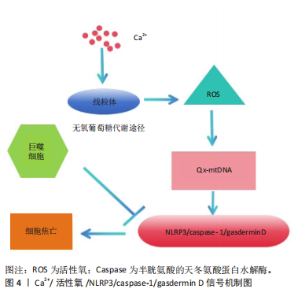 研究证实,巨噬细胞表型与不同的代谢特征有关。在促炎巨噬细胞中糖酵解会上调,而线粒体氧化磷酸化会被抑制。在心肌损伤的情况下,线粒体的功能以及活性氧产生线粒体的完整性是巨噬细胞效应器功能的中心[12]。线粒体对ATP生产(通过线粒体氧化磷酸化)至关重要,且线粒体区域是巨噬细胞中活性氧的主要来源。心肌梗死区巨噬细胞的转录组分析还显示其免疫功能的效应与线粒体自身功能密切相关,这与心肌梗死后重塑过程中巨噬细胞功能的变化相似。 2.2 线粒体钙稳态失衡-巨噬细胞焦亡途径的心肌保护机制 焦亡是由固有免疫所导致的细胞死亡,焦亡的同时伴有炎症因子的释放,这种死亡属于程序性过程,焦亡后细胞的形态变化具有凋亡和坏死两者的特征,此时大量的炎性因子和细胞内容物会由于细胞质膜孔的产生以及肿胀的细胞破裂而释放。焦亡主要发生于巨噬细胞,在分子水平上通常依赖于一个或多个含有半胱氨酸的天冬氨酸蛋白水解酶(cysteinyl aspartate specific proteinase,Caspase)激活,包括CASP1、CASP3、 CASP4、CASP5、CASP11,具体依赖于刺激启动[13]。Caspase-1可被氨基酸残基衔接蛋白和各种模式识别受体,形成的炎症小体水解后被激活,通过诱导白细胞介素18和白细胞介素1β的分泌,最终诱导细胞焦亡。 细胞焦亡也被认为是一种攻击性反应,由内在的免疫系统对病原体或损伤组织发起,有保护机体的作用。科学研究表明巨噬细胞焦亡与机体白细胞介素1β、白细胞介素18等炎症分子水平密切相关,影响固有免疫系统功能,并参与多种免疫相关疾病调控。当巨噬细胞处于氧化应激时,效应蛋白Gasdermin D(GSDMD)的4个氨基酸残基会被氧化,NLRP3炎症小体也会激活诱导线粒体膜电位下降以及活性氧的生成。发生急性心肌梗死时,干扰素调节因子2是其关键调节因子,可以触发GSDMD的激活[14]。此外,GSDMD能通过调节细胞焦亡导致心肌再灌注损伤,其也会破坏细胞膜的完整性并改变细胞渗透压,从而影响钙离子转运[15]。但巨噬细胞衍生的细胞外囊泡中会富集miR-378a-3p,可以阻断 NLRP3/Caspase-1/GSDMD 通路的激活,从而减轻心肌细胞的焦亡[16]。WANG等[17]的研究表明,GSDMD氧化修饰是线粒体活性氧促进NLRP3炎症体依赖性焦亡的新机制。NLRP3 炎症小体作为心肌梗死无菌性炎症的关键介质[18],另一项研究通过检测 PI(碘化丙啶)染色、白细胞介素1β和白细胞介素18在体外和体内的释放发现,蒜素可能通过促进线粒体自噬来减少细胞内活性氧的产生,以此减少NLRP3炎性小体活化的生成,从而减轻由脂多糖所诱导的巨噬细胞焦亡[19]。体外实验表明,在钙离子处于稳态时,钙离子进入线粒体,导致同时产生活性氧,活性氧导致线粒体跨膜电位改变,促进线粒体活性氧的产生,并氧化线粒体DNA。线粒体通透性转换孔打开,随后由于氧化还原失衡,更多的氧化线粒体DNA从线粒体释放到细胞质溶胶中,随之激活NLRP3/caspase-1/gasdermin D依赖性细胞焦亡,其相关机制见图4。"