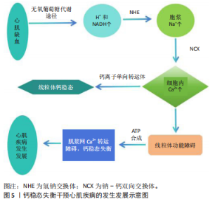 细胞的焦亡和与之相关的炎性因子一同在心血管疾病的进程中发挥着重要作用。综上所述,线粒体钙稳态失衡-巨噬细胞焦亡途径与急性心肌梗死后心肌保护有着密切关系。 2.3 线粒体功能障碍与钙稳态调控的主要途径 作为除细胞核以外细胞中唯一含有遗传物质的细胞器,线粒体是目前已知的真核细胞中最重要的细胞器之一。线粒体具有对脂肪、糖类、蛋白质等物质进行氧化及能量转换并最终为机体细胞提供能量的功能,在这一系列功能活动中涉及线粒体活性氧的产生及消亡,而活性氧的增减直接影响着线粒体功能,并最终干预疾病的发生发展[20]。现有研究表明线粒体的能量代谢、氧化应激等功能都参与了钙稳态的调控,且与心肌缺血再灌注损伤、心力衰竭等疾病的发生发展密切相关[21]。线粒体功能障碍主要有以下几个方面:细胞钙稳态的失衡、线粒体自身合成ATP的能力下降、程序性细胞死亡加重、细胞活性氧增加等。在心肌细胞活动中,心肌的收缩活动会消耗掉绝大部分ATP,细胞膜与肌浆网的各种离子泵也会消耗掉约1/3的ATP,通过上述举动来维持其正常的生理功能,从而实现心肌细胞电活动的运作。 钙离子浓度在心肌细胞内外存在较大的差距,静息状态下,钙离子在细胞内浓度是10-7 mol/L,在细胞外液的浓度大约为10-3 mol /L。而当机体细胞受到刺激时,细胞胞浆内钙离子浓度发生明显变化,进而引发兴奋-收缩偶联等一系列信号传导程。当机体心肌组织缺血时,血供减少区域细胞产生ATP会转为无氧葡萄糖代谢途径,使得H+和还原型辅酶Ⅰ(nicotinamide adenine dinucleotide, NADH)在细胞内迅速积累。此时,为恢复机体内的酸碱平衡则将开始作用位于细胞膜上的氢钠交换体( H+/Na+ exchanger,NHE) ,随之会导致胞浆钠离子的持续升高,继而将会激活钠-钙双向交换体(Na+ /Ca2+ exchanger,NCX),通过反向转运钙离子进入细胞内。已有的研究表明线粒体内存有少量的钙离子,线粒体钙稳态的维持主要通过摄取和排出的方式,国外的相关研究已证实线粒体自身具有转运钙离子的能力,这种能力主要通过钙离子单向转运体完成[22]。当心肌细胞线粒体功能发生障碍时,线粒体的氧化磷酸化能力会明显降低,ATP合成的减少最终会直接影响肌浆网钙离子的转运,钙稳态失衡干预心肌疾病的发生发展,其相关流程如图5。故可以初步认为,在机体发生心肌缺血时,线粒体功能障碍的发生可导致钙稳态失衡,最终影响心肌缺血的病理改变。 2.4 中药改善心肌损伤的研究现状 2.4.1 中药调控线粒体钙稳态机制 中医药是延续中华民族的伟大创造的瑰宝,也是一个有待开发的巨大宝库,随着现代科学技术在中医药上的不断深入,研究成果也愈发增多。 黄芪甲苷作为中药黄芪中的一种代表性皂苷,具有多种药理活性,在动物实验中显示出降低线粒体膜电位的作用,通过抑制细胞色素C来实现,同时可降低内质网Ca2+,升高胞浆及线粒体Ca2+浓度,调节细胞钙稳态并抑制细胞凋亡[23]。同样具有调节线粒体钙稳态作用的淫羊藿苷是中药淫羊藿中的一种活性成分,其作用机制是减"