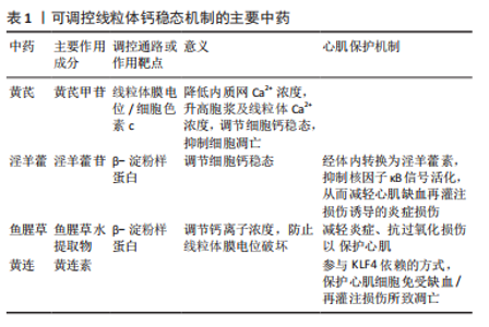 少β-淀粉样蛋白的沉积[24]。当这种活性成分在体内进行转化后,就形成了能减轻心肌缺血再灌注损伤诱导炎症损伤的淫羊藿素,这种心肌保护作用通过抑制核因子κB信号的活化实现[25]。对于β-淀粉样蛋白的调控,中药鱼腥草也具有一定的抑制作用,可调节钙离子浓度防止线粒体膜电位被破坏[26];小鼠实验进一步表明鱼腥草具有减轻炎症、抗过氧化损伤的功能,可发挥心肌缺血再灌注损伤的保护作用[27]。另一项研究表明,中成药双黄连可以作用于线粒体钙单向转运体来增强线粒体钙摄取,将有利于加强对钙稳态的调节[28]。黄连中的黄连素可通过参与Kruppel 样转录因子4(Kruppel-like factor 4,KLF4)依赖的方式,发挥保护心肌细胞免受缺血/再灌注损伤所致凋亡的作用[29]。 可调控线粒体钙稳态机制的主要中药见表1。 "