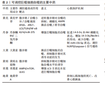 2.4.2 巨噬细胞自噬途径在中药的研究 中医药复方和单味药物均可对巨噬细胞的自噬途径有一定的影响,不同的药物可作用于不同的靶点产生不同的效果。脂多糖作为一个重要的生物学靶点,可以激活Akt/mTOR通路抑制巨噬细胞自噬;同时作为一个具有潜力的药物开发靶点,黄芪可作用于脂多糖,逆转其对自噬的抑制,还可通过磷酸化AMPK激活自噬[30]。除此之外,脂多糖还具有诱导巨噬细胞炎症的作用,而中药大黄中的大黄素可以激活巨噬细胞的自噬,抑制脂多糖对其诱导炎症的发生[31]。在对黄精水提物的研究中发现,其也能够抑制脂多糖对巨噬细胞自噬水平的诱导[32]。自噬的开始往往由自噬小体的形成标志,黄芪甲苷可以激活它的形成,也能提高自噬基因ATG5、ATG7、LC3的mRNA表达促进自噬[33]、抑制Toll样受体4(toll-Like Receptor 4,TLR4)/核因子κB信号通路诱导自噬[34]。在对从中草药丹参根中提取的主要成分丹参酮ⅡA的研究发现,其可通过激活KLF4,抑制miR-375增强巨噬细胞的自噬[35]。 又可促进14-3-3η和Akt磷酸化表达,增加14-3-3η/Beclin1的形成,减少心肌缺血后的细胞自噬发生,达到保护心肌缺血再灌注损伤的作用[36]。不仅如此,其也可通过抑制miR-155-5p表达减轻心肌缺血再灌注损伤[37]。在小鼠实验中,嵇成锋等[38]发现,丹参中的另一主要成分二氢丹参酮可通过参与NLRP3/caspase-1信号通路的调控,改善心肌缺血再灌注损伤引起的细胞损伤,抑制心肌细胞凋亡。青蒿素不仅有抗疟疾的作用,曹乾[39]通过实验研究表明中药青蒿中的青蒿素还能活化腺苷酸活化蛋白激酶(AMP-activated protein kinase,AMPK),通过促进mTOR、UNC-51样激酶1(UNC-51-like kinase 1,ULK1)磷酸化,增强LC3Ⅱ表达来促进巨噬细胞自噬。在中药复方的研究上,犀角地黄汤表现出能够显著降低Atg-5、Beclin-1 mRNA的能力,还能明显抑制LC-3的表达,通过这两条途径均可抑制细胞自噬[40]。此方中臣药地黄的主要成分地黄苷A,可改善心肌缺血造成的心肌组织损伤,其作用机制可通过抑制心肌细胞铁死亡实现[41]。复方补阳还五汤可以通过降低PI3K、P-62、P-mTOR的蛋白表达能力,增加P-Beclin1、ULK的表达,使炎症因子的释放减少,以此调节巨噬细胞的自噬水平[42],在通过调控细胞沉默调节蛋白1(polyclonal antibody to sirtuin 1,SIRT1)/FoxO1信号通路时,可发挥减轻心肌缺血再灌注损伤的作用[43],也可通过调节CD36-SRC-ERK5信号通路促进抗血小板活化,产生抗心肌缺血再灌注损伤作用[44]。通过减轻炎症反应改善心肌缺血再灌注损伤,清热化瘀方也可通过减少促炎因子白细胞介素17和白细胞介素6的释放来实现[45]。 可调控巨噬细胞自噬的主要中药见表2。 2.4.3 巨噬细胞焦亡途径在中药的研究 焦亡是一种由细菌感染诱导巨噬细胞中caspase-1依赖性细胞死亡的特殊形式,常伴有大量促炎症因子的释放。葛根作为复方葛根芩连汤中的君药,也是起主要疗效作用的一味中药,其中的关键活性成分葛根素与巨噬细胞NLRP3/Caspase-1焦亡信号通路有紧密联系[46],可抑制由氧化低密度脂蛋白诱导的焦亡活化并下调炎症细胞因子表达[47]。在对葛根素的研究中,SUN等[48]发现其可有效阻断巨噬细胞中NLRP3-Caspase-1-GSDMD介导的细胞焦亡,缓解细胞炎症,并通过实验证明葛根素的保护作用与P2X7受体密切相关,分子对接结果也证实了这一点。更进一步,张春艳等[49]利用分子对接和动态模拟揭示了葛根素缓"