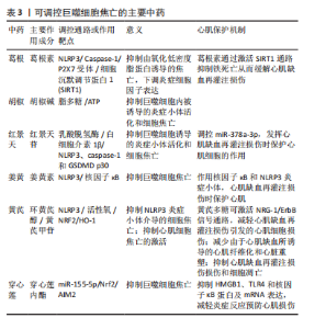 解心肌缺血再灌注损的具体作用机制,通过激活SIRT1通路抑制铁死亡从而缓解心肌缺血再灌注损伤,为葛根素充当心肌保护剂的临床使用提供了理论依据。在焦亡的启动中,脂多糖可通过激活炎症小体和caspase-1直接参与,而ATP则可能通过激活P2X7R等受体间接参与其中。胡椒碱作为胡椒等中医药用植物中的主要活性成分,可抑制巨噬细胞内被诱导的炎症小体活化和细胞焦亡,主要路径便是通过影响脂多糖和ATP实现[50]。有实验表明,在调控脂多糖/ATP诱导的巨噬细胞焦亡方面,中药红景天中红景天苷能通过够降低乳酸脱氢酶和白细胞介素1β的释放、NLRP3、caspase-1和GSDMD p30的蛋白水平参与[51]。此外,红景天可调控miR-378a-3p, 发挥心肌缺血再灌注损伤时保护心肌细胞的作用[52]。NLRP3炎症小体不仅可以被红景天苷作用,姜黄、莪术等中药姜科植物中的天然酚类抗氧化剂姜黄素,也可通过抑制核因子κB和NLRP3炎症小体抑制巨噬细胞焦亡[53],并可在此基础上发挥心肌缺血再灌注损伤时的保护作用[54],也可抑制GRP78/Caspase-12通路激活改善心肌缺血再灌注损伤造成的心肌细胞凋亡[55]。环黄芪醇,一种黄芪中分离出的天然活性小化合物,亦能显著抑制NLRP3炎症小体介导的细胞焦亡[56];其另一种活性物质黄芪多糖,则与激活NRG-1/ErbB信号通路密切相关,并可由此减轻心肌缺血再灌注损伤引发的心肌细胞损伤[57]。ZHANG等[58] 在动物实验研究中发现黄芪甲苷也有同样作用,抑制NLRP3炎症小体,可通过减少活性氧的释放达到并抑制心肌细胞焦亡的激活,同时可减少由于心肌缺血所诱导的心肌纤维化和心脏重塑;并能抑制心肌心肌缺血再灌注损伤和细胞凋亡,也可通过上调NRF2/HO-1信号通路的表达实现[59]。作为穿心莲中活性成分的穿心莲内酯,可下调促炎性 miR-155-5p的表达,进而促进Nrf2的表达,以抑制感染巨噬细胞中的细胞焦亡[60]。穿心莲内酯还可作用于AIM2炎症小体,抑制由其介导的巨噬细胞焦亡[61]。在预防心肌缺血再灌注损伤上,穿心莲内酯可通过抑制HMGB1、TLR4和核因子κB蛋白及mRNA表达,减轻炎症反应预防心肌损伤[62]。部分中药复方对巨噬细胞焦亡也有作用关系密切的靶点。实验研究发现,复方加味苇茎汤与Caspase-1/GSDMD通路密切相关,可减少炎症因子的释放,抑制巨噬细胞焦亡[63]。复方四妙勇安汤也表现出具有抑制巨噬细胞焦亡的作用,可作用于活性氧,通过抑制作用减少焦亡信号通路NLRP3、Caspase-1、GSDMD蛋白表达,对线粒体也有较强的保护作用进而抑制巨噬细胞焦亡[64]。 可调控巨噬细胞焦亡的主要中药见表3。"