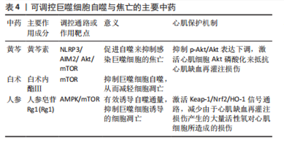 2.4.4 巨噬细胞自噬与焦亡途径在中药的研究 焦亡是调节性细胞死亡的促炎形式,在某些情况下,自噬和焦亡可以相互作用、相互影响。在对中药黄芩中黄芩素作用的分子机制研究中,结果表明黄芩素能下调AIM2和NLRP3炎症小体的组装,促进自噬来抑制感染巨噬细胞的焦亡。进一步的研究还表明,黄芩素这一作用是通过抑制Akt/mTOR通路激活,以及对AIM2蛋白的抑制实现的,这也说明了其对细胞自噬的影响[65]。动物实验也表明,黄芩素可抑制p-Akt/Akt表达下调,激活心肌细胞Akt磷酸化来抵抗心肌缺血再灌注损伤[66]。自噬与焦亡之间的关系,自噬往往对细胞凋亡具有双向作用,白术内酯Ⅲ是白术的主要活性成分,CHEN等[67]研究发现,其可通过mTOR依赖性方式抑制巨噬细胞自噬,从而减轻细胞凋亡。中药人参中的人参皂苷Rg1,也可抑制巨噬细胞诱导的细胞凋亡,这在YANG等[68]的分子机制研究中得到了证实,其作用途径是通过激活 AMPK/mTOR信号通路,从而有效诱导自噬通量。人参皂苷Rg1还可通过激活Keap-1/Nrf2/HO-1信号通路,减少由于心肌缺血再灌注损伤产生的大量活性氧对心肌细胞所造成的损伤[69]。 可调控巨噬细胞自噬与焦亡的主要中药见表4。"
