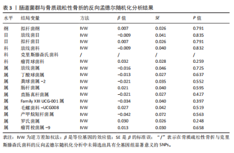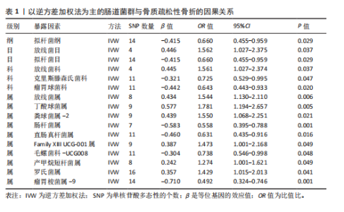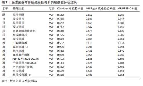 2.1 SNP的筛选结果 此正向MR分析中,文章根据工具变量的筛选标准,在全基因组统计学显著阈值(P < 1×10-5)下筛选出了160个SNPs,包括1个纲、2个目、3个科、10个属,所有纳入的SNP的F 统计量均大于10,表明所有SNP均为强工具变量。其中14个SNPs与拟杆菌纲相关,4个SNPs与放线菌目相关,14个SNPs与拟杆菌目相关,4个SNPs与放线菌科相关,11个SNPs与克里斯滕森氏菌科相关,11个SNPs与瘤胃球菌科相关,8个SNPs与放线菌属相关,9个SNPs与丁酸球菌属相关,9个SNPs与粪球菌属-2相关,7个SNPs与肠杆菌属相关,11个SNPs与直肠真杆菌属相关,9个SNPs与Family XIII UCG-001属相关,11个SNPs与毛螺菌科-UCG008相关,8个SNPs与产甲烷短杆菌属相关,16个SNPs与罗氏菌属相关,14个SNPs与瘤胃梭菌属-9相关,见表1。 2.2 孟德尔随机化分析结果 文章以IVW方法为主要分析方法,发现了16种与骨质疏松性骨折相关的肠道菌群,其中8种肠道菌群与骨质疏松性骨折呈正相关,另外8种肠道菌群与骨质疏松性骨折呈负相关。IVW方法分析结果显示,放线菌目(OR=1.562,95%CI:1.027-2.375,P=0.037)、放线菌科(OR=1.561,95%CI:1.027-2.374,P=0.037)、放线菌属(OR=1.544,95%CI:1.130-2.110,P=0.006)、丁酸球菌属(OR=1.781,95%CI:1.194-2.657,P=0.005)、粪球菌属-2(OR=1.550,95%CI:1.068-2.251,P=0.021)、Family XIII UCG-001属(OR=1.473,95%CI:1.001-2.168,P=0.049)、产甲烷短杆菌属(OR=1.274,95%CI:1.001-1.621,P=0.049)、罗氏菌属(OR=1.429,95%CI:1.015-2.013,P=0.041)的丰度升高,会增加患者骨质疏松性骨折的风险;拟杆菌纲(OR=0.660,95%CI:0.455-0.959,P=0.029)、拟杆菌目(OR=0.660,95%CI:0.455-0.959,P=0.029)、克里斯滕森氏菌科(OR=0.725,95%CI:0.529-0.995,P=0.047)、瘤胃球菌科(OR=0.643,95%CI:0.443-0.933,P=0.020)、肠杆菌属(OR=0.558,95%CI:0.395-0.788,P=0.001)、直肠真杆菌属(OR=0.631,95%CI:0.435-0.916,P=0.016)、毛螺菌科-UCG008 (OR=0.738,95%CI:0.546-0.998,P=0.048)、瘤胃梭菌属-9(OR=0.492,95%CI:0.324-0.746,P=0.001)的丰度升高,会降低患者骨质疏松性骨折的风险。此外,文章还使用了MR-Egger回归、WME方法、SM方法、WM方法对IVW方法的结果进行补充验证,结果显示,其他4种方法结果的方向与IVW方法一致,见图2。 2.3 敏感性分析结果 2.3.1 异质性检验和水平多效性检验结果 经Cochran’s Q检验和MR-Egger截距检验发现,P值均大于0.05,因此此MR分析结果不存在异质性和水平多效性。MR-PRESSO方法结果显示,未检测到离群值,见表2。 2.3.2 留一法检验结果 通过留一法检验评估此MR结果的稳定性,依次剔除每个SNP,再计算剩余SNPs的meta效应,结果显示,不存在单个SNP对因果关系估计值产生较大影响,表明此MR分析结果较为稳定,见图3。 2.4 反向MR分析结果 文章对骨质疏松性骨折与正向MR分析中确定的16个肠道菌群进行反向MR分析,除了以克里斯滕森氏菌科为结局变量的反向MR分析未筛选出具有全基因组显著意义的SNPs,其他分析结果的P值均大于0.05,表明骨质疏松性骨折与各个水平的肠道菌群不具有反向因果关系,进一步验证了正向MR分析得出的结果,见表3。"
