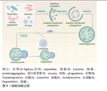 1963年比利时科学家DE DUVE首次提出“细胞自噬”这一概念[10],近年来被视为是细胞凋亡、坏死外的第3种死亡方式,并得到深入研究和发展(图3)。根据自噬机制及功能,将其分为巨自噬、微自噬及分子伴侣介导的自噬3类。自噬过程包括自噬体起始、延伸、成熟及与溶酶体结合等过程。自噬激活后在Ⅲ型磷脂酰肌醇3-激酶(class Ⅲ phosphoinositide 3-kinase,PI3K-Ⅲ)复合物、ULK复合物2个大分子物质参与下形成自噬体前膜,在自噬相关蛋白家族及其他泛素样反应的帮助下延伸包裹内容物,形成自噬小体,之后自噬体膜与溶酶体膜形成自噬溶酶体,所携带的底物被降解为氨基酸、脂肪酸等小分子物质[11-12]。正常情况下,自噬能清除受损的细胞器和变性的蛋白质,维持细胞内环境的稳态。病理状态下,自噬体的形成与自噬通量不等,导致自噬不足或自噬过度,则加重缺血性脑卒中后脑损伤[13]。因此,如何调控自噬,使其维持在有利水平是脑缺血损伤治疗的关键。细胞自噬过程见图4。"
