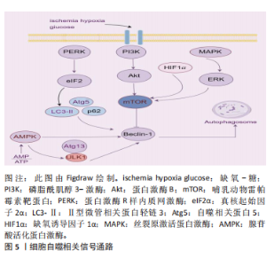发生时p62表达下降[18-19]。 2.3 自噬相关信号通路 2.3.1 PI3K/Akt/mTOR信号通路 PI3K/Akt是一种经典的自噬信号传导通路,哺乳动物雷帕霉素靶蛋白(mammalian target of rapamycin,mTOR)为其下游信号[20]。PI3K分为Ⅰ,Ⅱ,Ⅲ型,其中Ⅲ型PI3K与Beclin-1形成复合物,从而启动自噬。mTOR在细胞生长、增殖和自噬方面发挥重要调控作用[21]。mTOR分为mTOR复合物1(mTORC1)和mTOR复合物2(mTORC2),其中mTORC1是自噬的主要调节靶点[22]。mTORC1被p-Akt激活后磷酸化ULK1和自噬相关蛋白13可抑制自噬的发生,相反,使用雷帕霉素靶蛋白抑制剂则可诱导自噬的发生[23]。 2.3.2 PERK-eIF2α信号通路 蛋白激酶R样内质网激酶(PRKR-like endoplasmic reticulum kinase,PERK)是一种位于内质网膜上具有丝氨酸/苏氨酸结构域的Ⅰ型跨膜蛋白,eIF2α是PERK的下游信号分子[24]。缺氧刺激时,内质网分子伴侣葡萄糖调节蛋白78与PERK解离,蛋白激酶R样内质网激酶磷酸化后磷酸化下游真核起始因子2α,在p62、自噬相关蛋白5、LC3-Ⅱ等信号分子的作用下,激活细胞自噬[25]。反之,抑制PERK/eIF2α信号通路可减少自噬相关蛋白Beclin-1的过度激活,抑制自噬水平[26]。 2.3.3 AMPK-mTOR信号通路 腺苷酸活化蛋白激酶(adenosine monophosphate-activated protein kinase,AMPK)是一种AMP活化的丝氨酸/苏氨酸蛋白激酶,由催化亚基α和调节亚基β、γ组成,是主要的能量传感器之一。当AMP/ATP比值上调时,AMPK磷酸化,从而激活磷酸化TSC2及mTORC1中的Raptor蛋白,以抑制mTORC1活性,诱导自噬[27]。此外,腺苷酸活化蛋白激酶还可磷酸化ULK1的Ser555、Ser317和Ser777位点,直接激活ULK1,增强自噬。 2.3.4 丝裂原激活蛋白激酶介导的信号通路 丝裂原激活蛋白激酶由c-Jun氨基末端激酶,p38(α,β,γ和δ)、细胞外调节蛋白激酶1/2、细胞外调节蛋白激酶5家族构成,在脑缺血后被激活,传导细胞应激[28]。研究发现,c-Jun氨基末端激酶、p38活化受到抑制时,LC3-Ⅱ/LC3-Ⅰ比例降低,Beclin-1表达降低,细胞自噬水平降低[28]。 此外,调节细胞自噬的信号通路还包括核因子κB信号通路[29]、SIRT1/FOXO3a信号通路[30]、缺氧诱导因子1α/mTOR信号通路等[31]。见图5。"