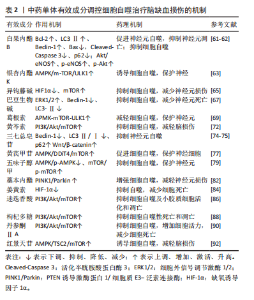 进内皮型一氧化氮合酶和Akt的磷酸化,抑制细胞自噬和凋亡,以改善神经功能[62]。 银杏内酯K亦是银杏叶的提取物成分。ZHANG等[63]研究发现银杏内酯K预处理可促进缺氧-葡萄糖剥夺诱导的星形胶质细胞增殖和迁移,并通过激活AMPK/m-TOR/ULK1通路,介导自噬相关蛋白表达,抑制细胞凋亡,提高细胞活力。同时应用复合物C阻断了这种保护作用,证实银杏内酯K通过调控AMPK/mTOR/ULK1通道诱导保护性自噬。 (2)生物碱类:异钩藤碱是一种从钩藤中提取的四环羟吲哚生物碱,具有抗炎、抑制神经元死亡和调节自噬等多种作用[64]。成家宏等[65]探讨异钩藤碱对缺血性脑卒中模型大鼠脑损伤及神经元自噬的影响,结果发现异钩藤碱能抑制缺氧诱导因子1α表达,激活mTOR,调控自噬关键蛋白,从而抑制神经元过度自噬,减少神经元凋亡,减轻脑损伤。 巴豆生物碱是从巴豆中分离出来的一种鸟嘌呤核苷类似物,具有抗炎、抗肿瘤、调节免疫等作用[66]。赵洪云等[67]研究巴豆生物碱对大脑中动脉栓塞/再灌注大鼠神经元损伤及自噬的影响,发现巴豆生物碱通过激活细胞外调节蛋白激酶1/2通路,下调Beclin-1、LC3-Ⅱ蛋白及mRNA表达,降低经元凋亡率,发挥神经保护作用,且高剂量效果最佳。 (3)黄酮类:葛根素是从葛根中提取的异黄酮类化合物,具有抗凋亡、抑制自噬、神经保护等作用[68]。WANG等[69]发现,葛根素预处理能激活APMK-mTOR-ULK1通道,调节相关靶点蛋白表达,减少大脑中动脉栓塞/再灌注大鼠海马CA1区自噬体的形成,减轻自噬,保护神经元。此外,田华等[70]亦通过实验证实,葛根素通过下调脑缺血再灌注小鼠大脑皮质自噬相关蛋白5及LC3Ⅰ/Ⅱ表达,提高小鼠平衡能力,发挥神经保护作用。 黄芩素是从黄芪根中提取的一种生物活性成分,具有抗炎、抑制凋亡、调节自噬等作用[71]。YANG等[72]发现,黄芩素可显著缩小梗死面积,促进PI3K/Akt/mTOR通路磷酸化,抑制神经元自噬,证实黄芩素可通过调控PI3K/Akt/mTOR途径,抑制细胞自噬,减轻大鼠脑缺血再灌注亚急性期损伤。 (4)皂苷类:三七总皂苷是三七的主要活性成分,具有保护血脑屏障、减轻脑含水量、减少细胞凋亡等多种作用[73]。乔园等[74]观察三七总皂苷对脑缺血再灌注模型小鼠自噬的影响,发现其可降低Beclin-1表达及LC3-Ⅱ/LC3-Ⅰ比例,上调p62表达,抑制神经元自噬。此外,芦君[75]也证实,三七总皂苷呈剂量依赖性上调Wnt3a、β-catenin表达,促进Wnt3a/β-catenin通道激活,调节神经元自噬。 黄芪甲苷是黄芪的主要活性成分之一,具有调节自噬、抗炎、抗血小板聚集、保护神经等作用[76]。张怡[77]在体外实验研究中发现,黄芪甲苷可激活AMPK/DDiT4/mTOR通路,提高缺氧-葡萄糖剥夺再灌注HT22细胞内Beclin-1表达及LC3Ⅱ/LC3Ⅰ,降低P62蛋白表达,增加自噬小体数量,提高自噬水平,保护缺氧-葡萄糖剥夺再灌注 HT22细胞。 (5)木脂素类:五味子醇甲是一种从五味子中分离出的木脂素类化合物。既往研究表明,五味子醇甲能减少细胞凋亡、抑制炎症及氧化应激以减轻脑缺血损伤[78]。WANG等[79]研究发现,五味子醇甲可减轻缺氧-葡萄糖剥夺再灌注 PC12细胞损伤,降低AMPK磷酸化,增加mTOR/p-mTOR表达,抑制细胞自噬,此外,给予MPK诱导剂AICAR预处理,可部分逆转五味子醇甲神经保护作用,提示五味子醇甲通过调节AMPK/mTOR通路,抑制缺氧-葡萄糖剥夺诱导的自噬,保护神经元。 (6)苯酞类:藁本内酯是当归和川芎的主要活性成分,具有抗凋亡、抗炎和调节能量代谢等作用[80-81]。MAO等[82]研究证实,藁本内酯通过调控PINK1/Parkin通道,增强线粒体功能,从而促进线粒体自噬,改善缺血诱导的神经元损伤。 (7)多酚类:姜黄素是从姜黄根部提取的一种多酚类化合物,具有减少细胞死亡、改善血脑屏障、抗炎和抗氧化应激等药理作用[83]。HOU 等[84]通过体外PC12 细胞缺氧-葡萄糖剥夺再灌注研究发现,姜黄素可抑制自噬和缺氧诱导因子1α表达,从而减少细胞死亡和凋亡,此外,给予3-甲基腺嘌呤处理效果一致,提示姜黄素通过调节自噬与缺氧诱导因子1α的关系,发挥神经保护作用。 迷迭香酸是从迷迭香中分离出来的一种多酚类物质,具有抗炎、调节自噬、抑制凋亡等作用[85]。刘书涵[86]的研究发现,迷迭香酸通过上调小胶质细胞Sirt3的表达,激活PI3K/Akt/mTOR通路,抑制细胞自噬,从而有效减少脑缺血中神经组织损伤,并抑制小胶质细胞极化和凋亡。 (8)多糖类:枸杞多糖是枸杞的主要活性成分,具有抗肿瘤、免疫调节和抗氧化应激等作用[87]。鱼洋[88]的体外实验研究发现,枸杞多糖能激活PI3K/Akt/mTOR通路,上调p-Akt、p-mTOR表达,下调活化半胱胺酸蛋白酶3、LC3-Ⅱ表达水平,抑制缺氧-葡萄糖剥夺再灌注诱导的细胞自噬性死亡和凋亡,保护神经元。 (9)菲醌类:丹参酮ⅡA是从丹参的根茎部提取的一种活性化合物,具有抗炎、抗氧化、调节自噬等作用[89]。ZHU等[90]对海马神经元细胞HT-22进行缺氧-葡萄糖剥夺再灌注,建立了脑缺血体外模型,经丹参酮ⅡA干预后显示,其可通过激活PI3K/Akt/mTOR信号通路,抑制细胞自噬,增加细胞活力,减少细胞死亡。 (10)其他:红景天苷是从红景天中提取的苯丙素糖苷类化合物,具有抗炎、抑制凋亡、调节自噬等作用[91]。LI等[92]研究发现,红景天苷可降低经缺氧-葡萄糖剥夺再灌注处理的PC12细胞乳酸脱氢酶活性,上调TSC2的表达,增加细胞活力,减少细胞凋亡,表明红景天苷通过调节AMPK/TSC2/mTOR通路诱导自噬,减轻脑缺血损伤。 由上可得,中药有效成