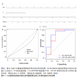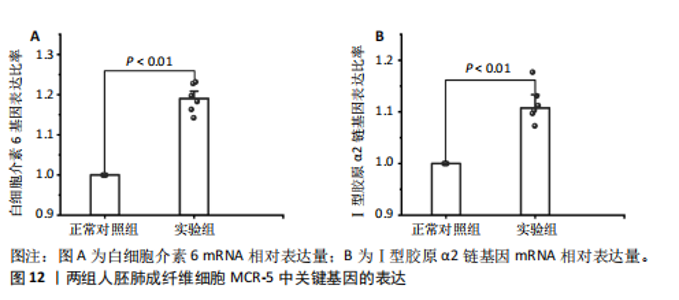 RESULTS AND CONCLUSION: (1) A total of 51 pulmonary fibrosis differential genes and 25 genes intersecting with autophagy genes were obtained. Gene ontology analysis showed that the 25 intersecting genes were related to extracellular matrix tissue, collagen metabolism, collagen pro-fibroblasts, and growth factor binding, etc. The results of Kyoto Encyclopedia of Genes and Genomes enrichment analysis indicated that they were mainly related to the Phosphatidylinositol 3-kinase/protein kinase B signaling pathway and the signaling pathway of the extracellular matrix-receptor interactions. (2) Immunoinfiltration analysis revealed that the expression of activated memory CD4+ T cells, M0 macrophages, and resting dendritic cells was significantly elevated in the pulmonary fibrosis group (P < 0.05), showing a strong correlation. (3) Two autophagy signature genes involved in the progression of pulmonary fibrosis were identified: COL1A2 and IL6. The column-line diagram model showed that the two core genes predicted the onset of pulmonary fibrosis more accurately, and the receiver operating characteristic curve analysis showed that the two characteristic genes had diagnostic significance. COL1A2 and IL6 were related to the cell-cycle pathway, mitogen-activated protein kinase signaling pathway, Janus kinase-signal transduction and activator of transcription signaling pathway and cytokine-cytokine receptor interactions. A total of 20 Chinese herbs were predicted to be related to COL1A2 and IL6 genes, and their efficacies were mainly to clear away heat and detoxify toxins and to invigorate blood and move qi. COL1A2 and IL6 were verified to be highly expressed in pulmonary fibrosis. To conclude, COL1A2 and IL6 may be potential diagnostic biomarkers for pulmonary fibrosis, but its specificity to pulmonary fibrosis needs to be further investigated.