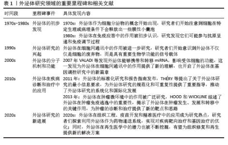 2.1 外泌体的生物特性 外泌体是一类由细胞分泌到细胞外的膜性囊泡,在多种生理和病理过程中发挥重要作用。外泌体的直径通常在30-150 nm之间,是最小的细胞外囊泡类型之一[1-6]。它们由脂质双分子层包裹,这种结构不仅为外泌体提供了稳定的物理屏障,还能够在复杂的生物环境中保持内容物的完整性。外泌体广泛存在于多种生物体液和组织中,包括血液、尿液、唾液、乳汁、羊水、滑液和脑脊液等[7-9]。 外泌体的内容物丰富多样,包含来自原始细胞的复杂成分,如细胞因子、蛋白质、RNA、miRNA和脂质等生物活性分子,这些成分赋予外泌体强大的生物学功能,能够参与细胞间的信息传递和调节[1-6]。例如,外泌体可以通过转运蛋白质和核酸等物质,调节受体细胞的基因表达和蛋白质合成,从而影响细胞的生理功能和状态[1-6]。此外,外泌体还能够重塑细胞外环境,通过释放生物活性物质,促进细胞间的通讯和协调[5]。 外泌体在多种生理和病理过程中发挥关键作用。例如,在免疫应答过程中,外泌体能够携带抗原和免疫调节分子,激活或抑制免疫细胞的功能,调节免疫反应的强度和方向[17-18]。在组织修复和再生过程中,外泌体通过促进细胞增殖、分化和血管新生,加速受损组织的愈合[19-21]。在癌症发生和发展中,肿瘤细胞分泌的外泌体能够携带致癌因子和促转移分子,促进肿瘤的生长、侵袭和转移[22-23]。因此,外泌体不仅在基础研究中具有重要的科学价值,而且在临床应用及生物医学领域中展现出广阔的前景,特别是在疾病诊断、治疗和药物递送等领域。关于外泌体发展的研究见表1。 "