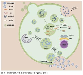 2.2 外泌体的生物学功能 外泌体在生物学和医学领域中扮演着重要的角色,其功能和作用机制有以下几个方面:①细胞代谢的调节:外泌体可以作为信号信使和载体,将信号传递给相应的靶细胞,从而改变生理功能和状态。外泌体含有脂质、蛋白质、DNA和RNA等多种生物活性分子,这些分子可以调节细胞代谢[5-6]。②炎症的控制:外泌体与各种炎症性疾病的发生发展密切相关[24-27]。在炎症状态下,外泌体释放增多,可以促使外泌体与受体细胞结合,进而使外泌体内含物的结构及生物性能发生改变,从而对受体细胞产生影响[28]。③促进血管新生:外泌体可以促进血管生成,例如在肿瘤组织内乏氧状态下释放的外泌体,刺激周围血管形成,促进肿瘤的生长及转移[29],间充质干细胞来源外泌体通过细胞因子促进血管生成,如miR-21可以通过PTEN/Akt途径促进血管生成[30-31]。④促进组织修复:外泌体可以通过携带多种生长因子和细胞因子,调节细胞外基质的合成和重塑,促进血管生成和神经再生,此外,外泌体能够携带多种生物活性分子,如蛋白质、脂质、核酸等,通过调节细胞信号传导、细胞增殖、迁移和分化等过程,促进软组织的修复和再生[20-21]。⑤免疫调节:外泌体通过携带多种生物活性分子,调节免疫细胞的激活与抑制、炎症反应的强度、免疫耐受的诱导以及免疫记忆的形成,从而在免疫调节中发挥重要作用[32-33],如NK细胞分泌的外泌体中还含有多种免疫成分,可通过旁分泌途径或通过循环系统靶向免疫系统来发挥免疫调节作用[34]。⑥癌症发生与发展:肿瘤细胞的外泌体与正常细胞的外泌体之间存在差异,研究发现肿瘤细胞会释放携带致癌因子与细胞凋亡因子的外泌体,使受体细胞癌变,而且携带特定的生物活性分子可改变受体细胞的基因表达和功能,从而促进肿瘤的生长和转移[35-36]。⑦抗原呈递:外泌体可以作为抗原呈递细胞的载体,将抗原信息传递给免疫细胞,从而激活免疫反应,树突状细胞是专业的抗原呈递细胞,其分泌的外泌体含有MHC分子和抗原肽复合物,能够有效地呈递抗原并激活T细胞,外泌体因能够携带抗原并激活免疫系统特性,被研究用于疫苗设计中,以增强免疫反应[37-39]。 此外,干细胞来源外泌体作为一种“无细胞治疗”策略,近年来在多种疾病的治疗中展现出显著的疗效,例如具有免疫调节、抗炎、抗纤维化、抑制氧化应激、增强血管生成等疗效[40]。研究发现,间充质干细胞来源外泌体能够通过携带免疫调节分子,调节T细胞和B细胞的功能,抑制过度的免疫反应,从而在自身免疫性疾病中发挥治疗作用[41];间充质干细胞来源外泌体通过诱导结肠巨噬细胞向免疫抑制的M2表型极化,减少炎症细胞因子和趋化因子的产生,增加抗炎细胞因子的浓度,从而有效缓解结肠炎症[42];在肝纤维化的治疗中,人骨髓间充质干细胞衍生外泌体通过 Wnt/β-catenin 通路缓解肝纤维化,从而减缓肝纤维化的进展[43];脂肪来源干细胞外泌体通过携带抗氧化分子,调节细胞内的氧化应激反应,从而保护心肌细胞免受氧化损伤[44];在缺血性疾病的治疗中,干细胞外泌体携带的血管生成因子,如血管内皮生长因子,能够促进血管内皮细胞的增殖和迁移,加速新生血管的形成,改善组织的血液供应[45]。这些研究表明,干细胞来源外泌体通过调节免疫反应、减轻炎症、抑制纤维化、清除氧化应激和促进血管生成等多种机制,在多种疾病的治疗中具有广泛的应用潜力,为临床治疗提供了新的思路和方法。 2.3 外泌体的生物发生过程 外泌体的形成过程可以分为几个关键步骤:①内吞作用:外泌体的形成始于细胞膜的内吞作用,细胞膜内陷形成早期内吞体,这些早期内吞体可以与其他细胞器融合,进一步成熟为晚期内吞体[5-6,46]。②多囊泡体(multivesicular bodies,MVBs)的形成:晚期内吞体内膜通过内向出芽作用形成多个腔内囊泡(intraluminal vesicles,ILVs),这些囊泡就是外泌体的前体,最终形成多囊泡体[5-6,46]。③外泌体的释放:大多数多囊泡体会与溶酶体融合,导致内容物的降解,而少数多囊泡体则通过与细胞膜融合,将腔内囊泡释放到细胞外,形成外泌体[5-6,46]。外泌体的具体生发过程示意图见图3。此过程涉及特定的膜蛋白如CD63和溶酶体跨膜蛋白(如LAMP1、LAMP2),这些蛋白在多囊泡体的膜表面发挥重要作用[5]。 "
