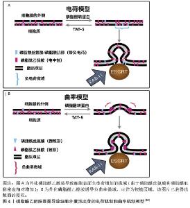 多囊泡体和腔内囊泡的形成主要依赖内吞体分选复合物(endosomal sorting complex required for transport,ESCRT)机制和非依赖内吞体分选复合物两种机制[5-6,46-48]。ESCRT复合物在调控多囊泡体的形成中发挥关键作用,包含ESCRT-0、ESCRT-I、ESCRT-II、ESCRT-III和相关的ATP酶VPS4复合物。ESCRT复合物通过在内吞体膜上时序性招募组装,介导泛素化的膜受体蛋白分选至腔内囊泡中,进而送至溶酶体被降解[46,48]。具体来说,ESCRT-0识别和分隔泛素化标记的内吞体膜跨膜蛋白;ESCRT-I与ESCRT-II协同作用,使内吞体膜通过内向生芽作用包裹特异的内容物;ESCRT-III将形成的囊泡剪开。ESCRT的解离和再循环需要ATP酶VPS4的辅助作用。除了ESCRT依赖的途径,多囊泡体也可以不依赖ESCRT途径而由特定脂质分子介导形成。参与调控多囊泡体形成的脂类主要包括神经酰胺、磷脂酸、鞘氨醇-1-磷酸等,这些脂类可能通过促进内吞体膜上富含鞘磷脂的“脂筏”微结构域的形成和进一步扩张,或诱发自发的负性曲度促进腔内囊泡的形成。细胞内生成多囊泡体后,降解型多囊泡体的主要功能是将内含物运送至溶酶体进行降解,在这一过程中,多囊泡体与溶酶体膜融合,使得多囊泡体内部的内含物(包括蛋白质、脂质和核酸等)被释放到溶酶体内;分泌型多囊泡体与细胞膜(质膜)融合,使得多囊泡体内部的内含物被释放到细胞外环境中。这一过程涉及到多种膜运输和融合蛋白,如RAB家族GTP酶和SNARE蛋白,它们协同作用促进多囊泡体与细胞膜的融合[5,46]。RAB家族蛋白主要在细胞囊泡运输过程中发挥功能,通过GTP和GDP结合形式的转换,起到分子开关的作用,调控囊泡的出芽、形成、转运、锚着和融合,SNARE家族蛋白则在囊泡融合过程中起关键作用,通过形成紧密的复合体,聚集脂膜,促进囊泡与质膜的融合[49]。 2.4 外泌体释放的生化调控机制 2.4.1 TAT-5抑制细胞外囊泡出芽 TAT-5具有磷脂反转酶活性,负责将磷脂分子从细胞膜的外侧转运到内侧,可维持磷脂酰乙醇胺在细胞膜上的不对称定位,防止磷脂酰乙醇胺暴露。若TAT-5缺失,磷脂酰乙醇胺暴露,会导致细胞外囊泡出芽。在秀丽隐杆线虫中,TAT-5是防止磷脂酰乙醇胺暴露所必需的,其缺失会导致磷脂酰乙醇胺暴露,进而引发细胞外囊泡出芽。TAT-5通常内化磷脂酰乙醇胺,而用一种磷脂翻转蛋白酶将磷脂酰乙醇胺外化,可能导致ESCRT复合体在细胞膜上募集或稳定,促使ESCRT复合体在细胞膜上出芽形成外泌体。RAB-11是一种与循环内体相关的GTP酶,可以将出芽所需的蛋白质传递到质膜上,也可以在出芽过程中发挥更直接的作用。综上所述,TAT-5的缺失导致磷脂酰乙醇胺外化,在细胞膜上形成负电荷微域和负曲率微域,这可能促进ESCRT复合体的募集和外泌体的形成。同时,RAB-11在这一过程中也发挥着重要作用,通过GTP酶活性影响蛋白质的运输和外泌体的出芽。这些机制共同参与了外泌体的生物合成和释放过程[50],见图4。"