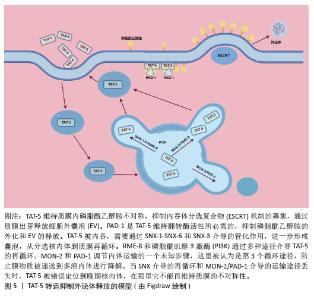 TAT-5在细胞内的定位受到细胞内冗余因子的调节[51],见图5。以下是一些关键的逆转运蛋白和相关因子,它们在调节TAT-5的定位和功能中起作用:①逆转运蛋白RME-8(DNAJC13):RME-8是人类DNAJC13的同源蛋白,它在内体蛋白运输中起作用,并与retromer和WASH复合体相关联,这两个复合体都与自噬有关。RME-8/DNAJC13在细胞蛋白稳态网络中作为一个正向调节因子,影响自噬过程[52]。 ②磷脂酰肌醇3激酶(phosphoinositide 3 kinase,PI3K):PI3K是一类具有丝氨酸/苏氨酸激酶活性的酶,它们在细胞内信号传导中起着关键作用,尤其是在自噬过程中。③PAD-1:PAD-1是一种Dopey结构域蛋白,它在植物中的功能与生长素稳态相关,但在动物细胞中,PAD-1可能与TAT-5的回收和定位有关[53]。④Beclin1同源蛋白BEC-1:Beclin1是自噬过程中的关键调节蛋白,它与Ⅲ类PI3K形成复合体来调节ATG蛋白在自噬前体结构中的定位,从而调节自噬活性。⑤Ⅲ类PI3Kinase VPS-34:VPS-34是自噬过程中的一个关键蛋白,它在细胞内除了诱导自噬之外,还能够通过激活p62,促进肿瘤的发生和发展;⑥Dna J结构域蛋白RME-8:RME-8/DNAJC13在细胞蛋白稳态网络中起作用,影响ATG9A的运输和自噬。RME-8、PI3K、PAD-1已被证实可抑制细胞微囊泡释放,Beclin1同源蛋白BEC-1、Ⅲ类PI3Kinase VPS-34、Dopey结构域蛋白PAD-1、Dna J结构域蛋白RME-8这4个基因的破坏可增加外泌体的释放,进一步研究证实TAT-5被这些逆转运相关蛋白通过不同的分子信号途径从胞质回收到质膜上[51]。 "