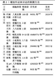 2.4.2 中性鞘磷脂酶抑制剂途径调控外泌体的分泌 鞘磷脂酶将膜脂质鞘磷脂水解为磷酰胆碱和神经酰胺,不同的鞘磷脂酶具有酸性、碱性或中性的最佳pH值,可以将丰富的膜脂质鞘磷脂水解为磷酰胆碱和神经酰胺,SMPD3是研究最多的中性鞘磷脂酶,由磷脂酰丝氨酸和磷脂酸等阴离子磷脂激活,SMPD2在体外和体内都具有中性鞘磷脂酶活性,并且定位于高尔基体和内质网[54]。神经酰胺是一种具有生物活性的鞘脂,参与许多生物学功能,如增殖、凋亡、分化和炎症,在外泌体的形成和分泌过程中起着至关重要的作用。用中性鞘磷脂酶抑制剂GW4869处理细胞后,外泌体的释放量可显著减少。近期有研究使用GW4869阻断蜱成虫唾液腺的外泌体分泌,从而达到了降低病毒传播率的效果[55]。微囊泡和外泌体是细胞外囊泡的两种形式,外泌体大小50-150 nm,微囊泡大小100-500 nm,微囊泡直接从质膜出芽,而外泌体从早期内体和多囊泡体中通过出芽形成腔内囊泡,并通过与质膜融合释放[56],中性鞘磷脂酶的抑制对两者的调节作用是不同的,用GW4869或RNAi对SMPD2/3抑制后,会减少外泌体的分泌,但也会增加质膜中微囊泡的分泌[56]。 2.5 目前已知调控外泌体释放的研究 目前已有报道称通过物理、生化手段可以提高外泌体分泌水平,其中一些新的方法可以使外泌体的产量提高约100倍,外泌体产量研究的进步使得外泌体的临床应用转化更易实现[57]。 2.5.1 关于提高外泌体分泌的物理方法及对外泌体的影响 (1)机械刺激:机械刺激可以影响外泌体的产生,有研究表明在特定的机械剪切力作用下,可以显著增加细胞外泌体的分泌量。具体来说,当低剪切率(1.5 mN/cm2)应用于3D柱阵列支架上培养的人真皮微血管内皮细胞时,与静水压力对照组相比,外泌体的分泌量可以显著增加,至少增加100倍[57],这表明适当的机械剪切力可以显著促进外泌体的分泌。而机械敏感性YAP抑制剂的加入导致外泌体分泌量急剧减少,再次证明了外泌体是由机械敏感性介导的分泌过程[58];循环张力负荷是细胞在各种组织中所受的另一种机械刺激,例如骨骼肌和心肌,与静态控制相比,当原代人骨骼肌细胞暴露于循环拉伸时,可将外泌体分泌量增加一个数量级[58];这些研究结果表明,机械刺激对外泌体的产生具有显著影响,并且这种影响可能通过特定的机械敏感性途径介导。这些发现对于理解外泌体的生物合成和分泌机制,以及开发新的外泌体生产技术具有重要意义。 (2)空间形状:有研究者发现培养细胞的空间几何形状会影响外泌体分泌的量[58-59],将细胞培养方案从传统的2D培养瓶换成具有3D几何结构的培养条件,可以增加外泌体分泌的量,例如有研究者比较了常规2D单层细胞培养与甲基丙烯酸羟乙酯涂布法形成的3D悬滴球体培养的骨髓间充质干细胞的外泌体分泌量,发现3D培养的方法使外泌体量分泌增加了3倍[59]。研究还探讨了3D培养提高外泌体产量的可能机制,包括球体尺寸增大导致的细胞数量减少以及缺氧、高细胞密度和非贴壁细胞形态等因素,结果表明非贴壁的圆形细胞本身可能是影响外泌体分泌的一个重要因素[59]。另一项研究中,通过3D培养的人脐带间充质干细胞衍生的外泌体(3D-hUMSCs-Exos)在治疗白癜风方面展现出更为显著的效果,这表明3D培养的外泌体在临床应用中具有潜力[60]。还有研究探讨了不同维度支架培养细胞产生的外泌体对减少β淀粉样蛋白沉积的影响,发现3D外泌体与2D外泌体中产生的miRNAs和蛋白质明显不同,3D外泌体能够在体内、体外上调ADAM10的表达,下调BACE1的表达,降低脑内β淀粉样蛋白的沉积[61]。综上所述,3D培养条件能够显著增加外泌体的分泌量,并且可能通过不同的机制影响外泌体的生物合成和分泌。这些发现对于优化外泌体的生产和应用具有重要意义。 (3)光刺激:高功率低水平激光照射是一种非侵入性的治疗方式,它使用特定波长的光来刺激细胞活动,促进组织修复和再生。Wnt信号通路是细胞内一个关键的信号传导系统,它在多种生物学过程中发挥作用,包括细胞分化、增殖和存活[62]。有研究显示高功率低水平激光照射通过Wnt信号通路可以增加人内皮细胞外泌体的分泌[63]。这一发现表明低水平激光照射可能成为一种新的治疗手段,通过调节外泌体的分泌来治疗与血管功能障碍相关的疾病。 (4)声刺激:有研究发现通过使用高频(4 W,10 MHz)超声刺激细胞可以使外泌体分泌量提高8-10倍,刺激模式为超声刺激10 min,细胞孵育30 min后再重复1次[64]。低强度脉冲超声是一种无创治疗方法,有研究发现,低强度(0.6-2.1 W/cm2或0.6-3.4 W/cm2)脉冲超声促进外泌体分泌,而较高强度(3.4-5.0 W/cm2或5.0 W/cm2)脉冲超声抑制外泌体分泌,这种现象可能与自噬有关[65],结果表明超声刺激是一种有效的手段,可以显著增加外泌体的分泌量,这对于外泌体的基础研究和临床应用具有重要意义[66-67]。 (5)电刺激:有研究者测试了低水平电刺激处理对细胞分泌外泌体的影响,在小鼠黑色素瘤和小鼠成纤维细胞上施加0.34 mA/cm2 电场持续60 min,可以引起外泌体分泌增加1.7倍[68]。这些研究结果证实了低水平电刺激可以作为一种有效的方法来增加细胞外泌体的分泌,这对于外泌体的基础研究和潜在的临床应用可能会提供一定思路。 2.5.2 通过干扰分子机制促进外泌体释放的方法 (1)基因水平干扰影响外泌体释放:敲除Rab4基因在促进外泌体生物发生方面具有较高的功效,