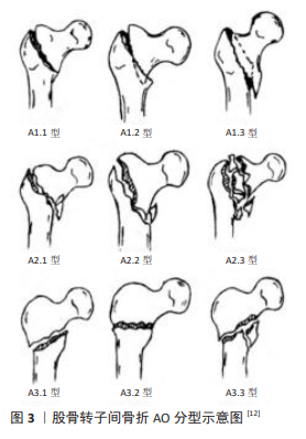2.1 股骨转子间骨折分型及手术治疗研究进展 2.1.1 股骨转子间骨折分型 股骨转子间区结构复杂,有大小转子、股骨近端内外侧壁、股骨距等解剖结构,存在颈干角、前倾角、扭转角等生理角度,重力负荷偏心传导,具有先天的不稳定性,骨折后容易出现滑动、剪切和旋转不稳定,导致骨折类型复杂、复位及固定困难[7]。目前较为公认的股骨转子间骨折分型包括Evans、Boyd-Griffin、Kyle、Jensen、Briot、AO分型等,其中Evans分型注重内侧皮质的完整性,认为内侧皮质不能完全复位者和反转子间骨折不稳定,髋内翻畸形率较高[8]。Jensen分型认为骨折的稳定性与是否波及大小转子区有关,包含大、小转子分离的复杂骨折存在较高的术后内固定失效率[9]。AO分型重视骨折的粉碎程度及内外侧皮质的完整性,将股骨转子间骨折分为A类3型共9个亚型[10],其中A2.2、A2.3以及A3型骨折属于公认的不稳定型骨折,包括不稳定的三部分、四部分骨折、粉碎性骨折以及反转子间骨折等[11],这些类型骨折由于太过粉碎,或者破坏了外侧壁、后内侧皮质等主要负重结构,术后更容易出现内固定失效,见图3。近年来学者还基于CT数据提出多种分型,包括Nakano分型、Shoda分型、Kijima分型、六部分骨折、张世民新综合分类等,但稳定性始终是股骨转子间骨折分型的核心考量。"
