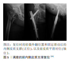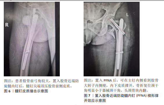 2.2 PFNA内固定失效手术相关因素 2.2.1 复位质量差 股骨转子间骨折通常使用Whitman法在牵引床上将患肢外旋、外展,而后牵引再内收、内旋即可复位,但有近10%的病例采用上述方法并不能获得满意的复位[21]。不良的复位会影响后续内植物的合理放置,进而导致内固定的失败[22]。判断转子间骨折复位良好与否,传统强调的是力学对线(Garden指数)和皮质对位,避免股骨干或头颈骨块出现大的旋转畸形。最常用的是1995年BAUMGAERTNER等[23]提出的评价标准:①对线:正位片上解剖对线或轻微外翻,侧位片上20°以内的前后成角;②对位:任何骨块之间的骨折间隙均≤4 mm。①②项均未达到为复位质量差,存在较高的内固定失效风险。 但股骨近端解剖结构和力学特性复杂,术中通过闭合操作取得完全的解剖复位比较困难,骨折断端复位固定后还会有二次滑动加压稳定的过程。为了避免头颈部骨块过度滑动导致内固定失败,除了传统上追求精确的对位对线外,还需要强调皮质对位的方向性以获得断端皮质接触砥住[24]。“非解剖皮质支撑复位”的概念由GOTFRIED等[25]在2012年针对股骨颈骨折提出,即认为通过实现远端骨块对近端骨块皮质的承托支撑(下包上),可以限制股骨头的过度滑动,称为“阳性支撑”。而转子间骨折复位后头颈骨块会斜向外下方滑动,如果内侧皮质没有起到良好的接触支撑作用,头颈骨块就会继续滑动落入髓腔,导致复位丢失。因此,CHANG等[26]提出“内侧皮质正性支撑复位”概念,与股骨颈骨折对位形式正好相反,认为头颈骨块内侧皮质居于股骨干内侧皮质的内上方(上包下)可以取得良好的皮质支撑,而且在后内侧皮质破坏、小转子难以复位的情况下,也强调侧位上前侧皮质的接触砥住,可以更好地避免复位的丢失,见图5,股骨近端前内侧皮质负性支撑则是内固定失效的危险因素。武英楷等[27]回顾性分析164例接受PFNA治疗的转子间骨折患者,随访6-12个月,发现失败组的正性支撑与负性支撑比值为4/23,高于外侧壁类型及螺旋刀片位置等危险因素比值。RAMACHANDRAN等[28]采用髓内钉治疗72例不稳定转子间骨折,结果表明在治疗效果方面正性支撑组较优。PARK等[29]通过比较8对冷冻股骨标本进行的生物力学研究结果显示,内侧皮质正性支撑组在轴向强度、最大载荷方面均优于阴性支撑,且认为前内侧皮质正性支撑复位具有更好的稳定性。与传统复位评价标准相比,“前内侧皮质正性支撑复位”理论不仅重视对位的精准度,而且强调对位方向,依靠自身骨质的稳定性分担髓内钉所受负荷,其所提供的皮质砥住是限制PFNA术后头颈骨块过度滑动的重要支撑[30]。而且相比于追求解剖复位,正性支撑更容易获得,且预后更好,对临床具有重要意义。"