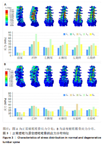2.2 椎骨应力分布 在正常腰椎中,L1-5在前屈、后伸、侧屈和旋转方向的应力值呈现一定的规律性变化。例如,L4在后伸方向应力达到最大值76.02 MPa,而L1的前屈应力值最高为30.81 MPa;与其他节段相比,L3的应力在旋转运动时(36.03 MPa和36.60 MPa)相对较高,该节段在旋转活动中更易受到应力集中。L4的应力值在后伸和侧屈时明显高于其他节段,尤其是在后伸时达到76.02 MPa,提示L4节段在正常生理活动中承受较大的力学负荷,可能成为应力集中的高风险区域。应力云图显示,应力主要集中在小关节与峡部位置;前屈时,椎骨应力相对小且主要集中在L1位置,其余工况下,应力集中主要集中在L3-5节段(图3A)。 在退变腰椎中,应力值总体下降,总体而言,退变腰椎的应力值呈现普遍下降趋势,尤其是在L4和L5节段。L4在左侧屈时应力从正常的57.60 MPa降至16.07 MPa,L5的右旋转应力从34.83 MPa降至25.42 MPa。L3节段在退变状态下应力集中,L3左旋转应力为43.12 MPa,显著高于正常状态的36.03 MPa,表明退变腰椎中L3节段在旋转运动中的力学负担加重。此外,退变腰椎的应力分布模式发生了明显改变:在侧屈载荷下,应力集中区域向头侧迁移;而在旋转载荷下,应力集中区域则向尾侧迁移至L4和L5节段(图3B)。这些变化提示腰椎退变可能导致力学负荷的重新分布,进而影响脊柱的整体生物力学行为。"
