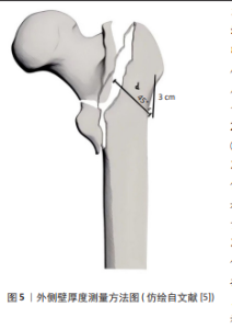 尽管外侧壁状态得到了更多重视,但目前股骨外侧壁厚度测量方式仍存在争议:①因为患者个体差异性,所收集的骨折病例数据不同,因而提出的外侧壁厚度阈值也不一致。2017年SREEJITH等[16]回顾分析66例接受动力髋螺钉治疗的股骨转子间骨折病例,提出了术中外侧壁破裂临界值为20.55 mm。2018年PRADEEP等[17]进行一项涉及135例患者的研究,提出了术前外侧壁厚度阈值为21 mm。2021年SELIM等[18]基于一项前瞻性队列研究,提出外侧壁厚度阈值是19.6 mm。2023年VAN KNEGSEL等[19]开发双侧对比评估体系,通过定义健侧转子间总厚度为从健侧外侧皮质到沿头颈轴线的粗隆间线的距离,在骨盆标准正位X射线片上测量相对外侧壁厚度,即患侧外侧壁厚度与健侧转子间总厚度百分比比值,以此预测围术期外侧壁骨折风险,发现与外侧壁厚度相比,相对外侧壁厚度是预测围术期外侧壁骨折更准确、更个性化的因素,当相对外侧壁厚度低于50.5%时,预示着围术期会发生更多外侧壁骨折。②股骨大转子无名结节具体位置难以定位。国内学者陶金等[20]认为将无名结节标记为大转子偏外侧适合外侧壁厚度的测量。国外学者SHARMA等[21]则建议以股外侧肌嵴下方20 mm处的股骨外侧皮质代替大转子无名结节下方30 mm处作为测量点。2018年张世民等[22]指出,以上两种不同测量点所测得的外侧壁厚度实际就是骨折后前方皮质及后方皮质的残留长度和均值,不论以哪个测量点进行测量,当外侧壁厚度>20.5 mm时,外侧壁被认为是完整的。③髋部正位X射线片所测图像不一定准确。常规正位X射线摄片存在影像清晰度不足及骨折端重叠干扰的问题,同时股骨旋转体位偏差易产生测量误差。YIN等[23]提出的牵引内旋标准化摄片技术可有效提升测量精度,但受限于患者疼痛耐受度,实际临床操作中难以规范实施。HECHT等[24]系统对比X射线片与三维CT重建两种影像学方式对外侧壁形态的测量效果,发现CT对外侧壁形态测量更准确,可更好地评估术中外侧壁破裂风险,因此推荐术前使用CT评估外侧壁状态。 2.3 外侧壁宽度、高度及面积 在外侧壁这一解剖区域,不光具有厚度,还具有宽度、高度及面积。2016年张世民等[25]提出,外侧壁高度为股外侧肌嵴最高点至小转子中点平面的距离,外侧壁宽度为其高度的中点平面的股骨前后径,外侧壁面积即高度与宽度相乘,面积的大小真正反映了矢状面的高度和冠状面的宽度,可能比单独的外侧壁厚度更有指导价值,见图6。张世民团队[25]通过16具尸体标本测量外侧壁高度均值为(24.4±2.4) mm,宽度均值为(23.3±2.0) mm,面积均值为(567.0±82.8) mm2。此区域为大小转子间外侧骨皮质,是内固定物的主要进钉区域,其完整性直接影响术后稳定性。"