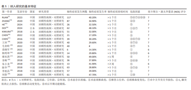 | [1] STEPHENS BF, RHEE JM, NEUSTEIN TM, et al. Laminoplasty Does not Lead to Worsening Axial Neck Pain in the Properly Selected Patient With Cervical Myelopathy: A Comparison With Laminectomy and Fusion. Spine. 2017;42(24):1844-1850. [2] ZHANG X, GAO Y, GAO K, et al. Factors associated with postoperative axial symptom after expansive open-door laminoplasty: retrospective study using multivariable analysis. Eur Spine J. 2020; 29(11):2838-2844. [3] HOSONO N, YONENOBU K, ONO K. Neck and shoulder pain after laminoplasty. A noticeable complication. Spine. 1996; 21(17):1969-1973. [4] ZHENG B, GUO C, ZHAO C, et al. Global Tendencies and Frontier Topics in Cervical Laminoplasty: A Bibliometric Analysis from 1982 to 2023. World Neurosurg. 2024;191: 91-101. [5] RUAN C, JIANG W, LU W, et al. Analysis of risk factors for axial symptoms after posterior cervical open-door laminoplasty. J Orthop Surg Res. 2023;18(1):954. [6] CHIBA K, OGAWA Y, ISHII K, et al. Long-term results of expansive open-door laminoplasty for cervical myelopathy--average 14-year follow-up study. Spine. 2006;31(26): 2998-3005. [7] LIN CR, TSAI SHL, TSAI PA, et al. What is the best strategy for C3 in open-door laminoplasty: laminectomy versus laminoplasty-a systematic review and meta-analysis. Spine J. 2025;25(7):1440-1454. [8] 仇子叶, 马昱堃, 俞兴, 等. 颈椎术后轴性症状与影像学评价指标相关性的研究进展[J]. 生物骨科材料与临床研究, 2023,20(1):80-84. [9] 单杰. 颈椎单开门术后轴性症状的危险因素分析[D]. 乌鲁木齐:新疆医科大学, 2023. [10] LIU FJ, DING XK, CHAI Y, et al. Influence of fixed titanium plate position on the effectiveness of open-door laminoplasty for cervical spondylotic myelopathy. J Orthop Surg Res. 2022;17(1):297. [11] DU W, WANG S, WANG H, et al. Cervical alignment and clinical outcome of open-door laminoplasty vs. laminectomy and instrumentation in kyphotic multilevel cervical degenerative myelopathy. Arch Orthop Trauma Surg. 2023;143(3): 1429-1440. [12] LI Z, LIANG Q, LI H, et al. Fatty infiltration of the cervical multifidus musculature and its clinical correlation to cervical spondylosis. BMC Musculoskelet Disord. 2023;24(1):613. [13] ZHENG B, ZHU Z, LIANG Y, et al. Cervical Subcutaneous Fat Thickness and Its Association with Sagittal Parameters and Clinical Outcomes Following Laminoplasty in Patients with Cervical Spondylotic Myelopathy. World Neurosurg. 2025;199:124069. [14] JIANG Z, FU X, DU W, et al. Changes in cervical sagittal parameters and the impact on axial symptoms after two types of posterior single-door cervical decompression surgeries. J Clin Neurosci. 2025;137:111293. [15] HE W, PAN J. Influencing factors for axial symptoms after modified expansive open-door laminoplasty. Ceska a Slovenska Neurologie a Neurochirurgie. 2024;87(4): 264-268. [16] KIM AH, AVENDANO JP, GREENBERG M, et al. The Impact of Cervical Laminoplasty and Cervical Foraminotomy on Axial Neck Pain: A Systematic Review and Meta-Analysis. Global Spine J. 2025;15(6): 21925682251319544. [17] 谢水清, 孙天威, 田融, 等. 脊髓型颈椎病单开门椎板成形术后轴性症状的危险因素分析[J]. 中国修复重建外科杂志, 2014,28(5):620-624. [18] STANG A. Critical evaluation of the Newcastle-Ottawa scale for the assessment of the quality of nonrandomized studies in meta-analyses. Eur J Epidemiol. 2010; 25(9):603-605. [19] LI C, TANG X, ZHENG X, et al. Global Prevalence and Incidence Estimates of Oral Lichen Planus: A Systematic Review and Meta-analysis. JAMA Dermatol. 2020;156(2):172-181. [20] PETIT CB, HUSSAIN ZB, MCPHERSON A, et al. Graft Failure in Pediatric Patients After Bone-Patellar Tendon-Bone, Hamstring Tendon, or Quadriceps Tendon Autograft ACLR: A Systematic Review and Meta-analysis. Orthop J Sports Med. 2024;12(11):23259671241289140. [21] ZHAO H, QI C, ZHANG Y, et al. Correlation between uric acid levels and bone mineral density in patients with type 2 diabetes mellitus: a systematic review and meta-analysis. Front Endocrinol (Lausanne). 2025;16:1415550. [22] HUANG T, LI C, CHEN F, et al. Prevalence and risk factors of osteosarcopenia: a systematic review and meta-analysis. BMC Geriatr. 2023;23(1):369. [23] ZHANG X, GAO Y, GAO K, et al. Factors associated with postoperative axial symptom after expansive open-door laminoplasty: retrospective study using multivariable analysis. Eur Spine J. 2020; 29(11):2838-2844. [24] DOI K, OKAZAKI T, TANI S, et al. The new proposal of the relationship between axial pain and hinge fracture and facet involvement after open-door laminoplasty with titanium spacers. J Craniovertebr Junction Spine. 2024;15(3):321-325. [25] KIMURA A, SHIRAISHI Y, INOUE H, et al. Predictors of Persistent Axial Neck Pain After Cervical Laminoplasty. Spine. 2018;43(1): 10-15. [26] CHEN K, YU J, NIE C, et al. Preoperative dynamic quantitative sensory testing in remote pain-free areas is associated with axial pain after posterior cervical spinal surgeries. BMC Musculoskelet Disord. 2022;23(1): 409. [27] CHEN H, LIU H, DENG Y, et al. Multivariate Analysis of Factors Associated With Axial Symptoms in Unilateral Expansive Open-Door Cervical Laminoplasty With Miniplate Fixation. Medicine. 2016;95(2):e2292. [28] 王冰, 刘涛. 单开门椎板成形钢板内固定术后轴性疼痛相关因素分析[J]. 颈腰痛杂志, 2020,41(1):26-28. [29] 毛省岭, 肖江岭. 多节段脊髓型颈椎病患者后路单开门椎管扩大成形术后发生颈椎轴性痛的影响因素分析[J]. 四川解剖学杂志,2022,30(2):11-13. [30] 袁晓军, 徐文华, 林军明, 等. 多裂肌萎缩与颈后路单开门术后轴性症状发生的相关性研究[J]. 宜春学院学报,2022, 44(12):48-51. [31] 杨明坤, 张旭, 刘川, 等. 改良椎管扩大成形术术后发生轴性症状的危险因素分析[J]. 国际骨科学杂志,2020,41(5): 318-322. [32] 李辉, 郝定均, 刘鹏, 等. 颈后路单开门椎板成形术后轴性症状的危险因素分析[