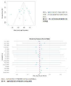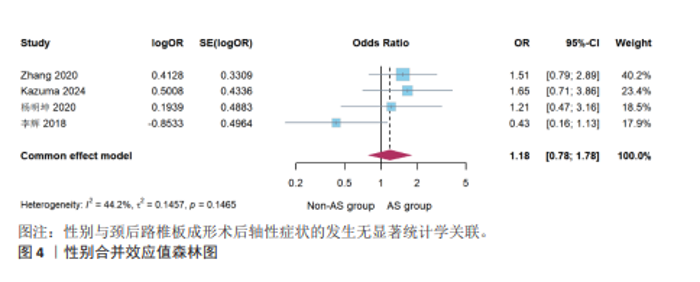 2.3 Meta分析结果 2.3.1 颈后路椎板成形术后轴性症状的发生率 共有17项研究报告了颈后路椎板成形术后轴性症状的发生率[5,15,17,23-36]。结果显示,研究间存在显著异质性,为了进一步探讨异质性的来源,基于文献中是否按照1∶1比例纳入对照组,进行亚组分析,然而,由于1∶1对照组中研究仅为1项,异质性结果仍然较高。此外,由于1∶1对照组在选取患者时严格遵循了与轴性症状组等比例的原则,这可能导致其结果无法准确反映实际发生率。因此,最终分析中将该亚组予以排除。为评估结果的稳定性,进行了敏感性分析,结果显示剔除任意单项研究后,结果均无显著变化。分析结果显示,颈后路椎板成形术后轴性症状的发生率为34.88%(95%CI:0.301 6-0.399 0),结果见图2。 2.3.2 年龄 共有4项研究纳入了年龄这一变量[24,30,35-36]。异质性检验结果显示,I2=89%,P < 0.000 1,提示研究间存在较高的异质性。为进一步探讨异质性的来源,采用逐一排除法对单项研究进行敏感性分析,结果显示剔除任一研究后异质性均未发生显著变化,因此,最终采用随机效应模型对效应值进行合并分析。Meta分析结果显示,年龄与颈后路椎板成形术后轴性症状的发生无显著统计学关联(OR=1.07,95%CI:0.95-1.21,P=0.25),结果见图3。 "