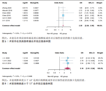 2.3.4 术前存在颈肩部疼痛 共有6项研究纳入了术前存在颈肩部疼痛这一变量[23,25-27,31,34]。异质性检验结果显示,I2=0%,P=0.471 5,提示研究间无显著异质性。为了进一步验证结果的稳定性,采用逐一排除法对单项研究进行敏感性分析,结果表明剔除任一研究后异质性均未发生显著变化,因此,最终采用固定效应模型对效应值进行合并。Meta分析结果显示,术前存在颈肩部疼痛是颈后路椎板成形术后轴性症状的独立危险因素(OR=2.35,95%CI:2.20-2.50,P < 0.000 1),结果见图5。 2.3.5 术前颈椎曲度小于12° 共有3项研究纳入了术前颈椎曲度小于12°这一变量[17,28-29]。异质性检验结果显示,I2=0%,P=0.946 6,提示研究间无显著异质性。为验证分析结果的稳健性,采用逐一排除法对单项研究进行敏感性分析,结果显示剔除任一研究后异质性均未发生显著变化,因此,最终采用固定效应模型对效应值进行合并分析。Meta分析结果显示,术前颈椎曲度小于12°是颈后路椎板成形术后轴性症状的独立危险因素(OR=3.16,95%CI:1.91-5.24,P < 0.000 1),结果见图6。 "