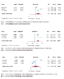 2.3.6 术前颈椎椎管占位率 共有3项研究纳入了术前颈椎椎管占位率这一变量[5,15,33]。异质性检验结果显示,I2=74.2%,P=0.020 8,提示研究间存在较高异质性。为探讨异质性的潜在来源,采用逐一排除法进行敏感性分析,结果显示剔除任一研究后异质性未发生显著变化,分析结果稳定,因此,最终采用随机效应模型对效应值进行合并分析。Meta分析结果表明,术前颈椎椎管占位率是颈后路椎板成形术后轴性症状的独立危险因素(OR=1.35,95%CI:1.02-1.79,P=0.034 0),结果见图7。 2.3.7 术中发生关节突关节损伤 共有3项研究纳入了术中发生关节突关节损伤这一变量的分析[24,28-29]。异质性检验结果显示,I2=0.00%,P=0.416 1,提示研究间无显著异质性。为验证分析结果的稳健性,采用逐一排除法对单项研究进行敏感性分析,结果表明剔除任一研究后异质性未发生显著变化,分析结果仍保持稳定,因此,采用固定效应模型对效应值进行合并分析。Meta分析结果显示,术中发生关节突关节损伤是颈后路椎板成形术后轴性症状的独立危险因素(OR=2.87,95%CI:1.96-4.19,P < 0.000 1),结果见图8。 2.3.8 术中关节突关节损伤数量 共有3项研究纳入了术中关节突关节损伤数量这一变量的分析[5,27,34]。异质性检验结果显示,I2=89.4%,P < 0.000 1,提示研究间存在较高异质性。为探讨异质性的潜在来源,进行了逐一排除法的敏感性分析,结果表明剔除任一研究后异质性未发生显著变化,分析结果稳定,因此,采用随机效应模型对效应值进行合并分析。Meta分析结果显示,术中关节突关节损伤数量与颈后路椎板成形术后轴性症状的发生无显著统计学关联(OR=1.00,95%CI:0.57-1.75,P=0.991),结果见图9。 "