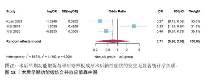 2.3.9 术中C7棘突肌肉止点损伤 共有3项研究纳入了术中C7棘突肌肉止点损伤这一变量的分析[5,28,35]。异质性检验结果显示,I2=82.1%,P=0.003 8,提示研究间存在较高异质性。为进一步探讨异质性的潜在来源,采用逐一排除法对单项研究进行敏感性分析,结果表明剔除任一研究后异质性未发生显著变化,分析结果稳定,因此,最终采用随机效应模型对效应值进行合并分析。Meta分析结果显示,术中C7棘突肌肉止点损伤与颈后路椎板成形术后轴性症状的发生无显著统计学关联(OR=1.16,95%CI:0.29-4.59,P=0.832 8),结果见图10。 2.3.10 颈椎曲度变化 共有4项研究纳入了该变量的分析[5,27,31-32],初步结果显示异质性较大。为明确异质性来源,采用逐一排除法进行敏感性分析,结果表明剔除杨明坤等[31]的研究后,异质性显著降低(I2=0%,P=0.665 5),因此,选用固定效应模型对效应值进行合并分析。分析结果显示,颈椎曲度变化是颈后路椎板成形术后轴性症状的独立危险因素(OR=1.10,95%CI=1.03-1.17,P= 0.002 9)。结果见图11。 2.3.11 颈椎活动度变化 共有3项研究纳入了颈椎活动度变化这一变量的分析[5,27,34]。异质性检验结果显示,I2=0%,P=0.480 3,提示研究间无显著异质性。通过逐一排除法进行敏感性分析,结果表明剔除任一研究后异质性未发生显著变化,分析结果稳定,因此,采用固定效应模型对效应值进行合并分析。Meta分析结果显示,颈椎活动度变化是颈后路椎板成形术后轴性症状的独立危险因素(OR=1.09,95%CI:1.04-1.14,P=0.000 5),结果见图12。 "