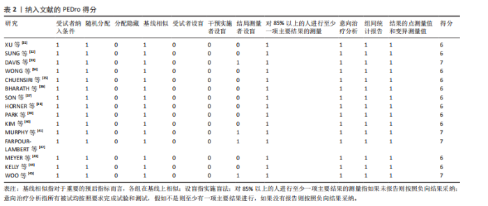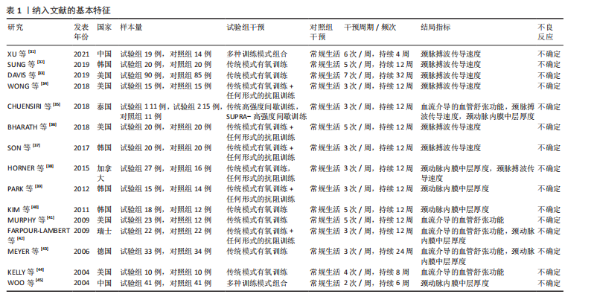2.1 文献检索结果 通过对4个数据库进行文献检索,共检索出1 258篇文献,通过EndNote 19文献管理软件将1 258篇英文文献导入并进行重复文献筛除,初步得到495篇文献。通过逐级阅读文章标题及摘要,去除非运动干预文献后共获得44篇文献,最后通过阅读全文剔除非儿童青少年干预、非肥胖超重文献、非随机对照试验、结局指标不符合纳入标准的文献32篇,与其他方法纳入的研究合并,最终纳入符合标准的文献15篇[31-45]。文献检索流程见图2。 2.2 纳入文献的基本特征 纳入的15篇文献中,有7篇文献的试验组采用传统有氧训练方法[32-33,38,40-41,43-44],5篇文献的试验组采用有氧与抗阻结合训练的方法[34,36-37,39,42], 2篇文献的试验组采用混合训练方案[31,45],1篇文献的试验组采用间歇性训练方式[35],1篇文献的试验组采用抗阻训练的方式进行结局指标的测量[38],其中有2篇文献采用了双臂干预方式[35,38],对照组均为常规生活。纳入文献基本特征表见表1。 2.3 纳入文献质量评估结果 依据PEDro量表标准判定,得分6分以上即为较高质量文献,纳入的15篇文献得分均在6分以上,见表2。由于"