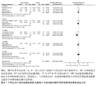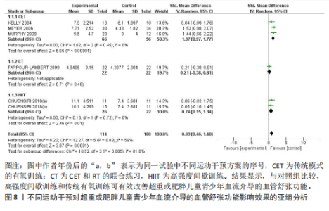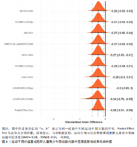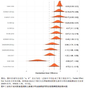 运动干预类型的可知性,导致对受试者和干预者设置盲法受阻,但仍有4篇文献对结局测量者进行设盲,提升了所取文献的可信度[33,41-42,45]。 根据Rob 2.0偏倚风险评估工具对纳入文献的随机化过程、偏离预期干预措施、结果数据的缺失、报告结果的选择进行偏倚评估,1篇文献由于设备变化和退出导致试验组与对照组样本量不均衡,被评估为高风险[38]。其余文章均为中低风险文献,其中低风险文献为5篇[32,39,41-42,44],见图3。 综上所述,文章通过 PEDro 评分量表与 RoB 2.0 偏倚风险图结合进行双重评级,最终纳入文献均在 PEDro 评分上达标,并且除1篇高偏倚风险外,其余文献均为中低风险,具备较高的可信度与方法学质量,进一步验证了该研究的可靠性。 2.4 基于贝叶斯模型下运动干预对超重或肥胖儿童青少年的Meta分析2.4.1 总体分析森林图颈脉搏波传导速度:8篇文献分析了运动干预对超重或肥胖儿童青少年颈脉搏波传导速度的影响[31-38]。异质性检验(I2=93%,P < 0.000 01)显示研究间异质性较高,采用随机效应模型进行分析。由于此次研究纳入单位不一致,故采用SMD标准化均数差进行合并效应量检验。森林图中显示的不是每个研究观察的效应量,而是基于贝叶斯模型中的每个研究估计到的效应量,结果显示运动干预可以改善超重或肥胖儿童青少年的颈脉搏波传导速度[SMD=-0.72,95%CI(-1.30,-0.15)],见图4。 血流介导的血管舒张功能:6篇文献分析了运动干预对超重或肥胖儿童青少年血流介导的血管舒张功能的影响[35,41-44]。异质性检验(I2=57%,P < 0.000 01)显示研究间异质性较高,采用随机效应模型。由于此次研究纳入单位不一致,故采用SMD标准化均数差进行合并效应量检验。森林图中显示的不是每个研究观察的效应量,而是基于贝叶斯模型中的每个研究估计到的效应量,结果显示,与对照组比较,运动干预可以改善超重或肥胖儿童青少年血流介导的血管舒张功能[SMD=0.91,95%CI(0.38,1.40)],见图5。 颈动脉内膜中层厚度:7篇文献分析了运动干预对超重或肥胖儿童青少年颈动脉内膜中层厚度的影响[35,38-40,42-43,45]。异质性检验(I2=0%,P=0.792 1)显示研究间异质性较低,采用固定效应模型。由于此次研究纳入单位不一致,故采用SMD标准化均数差进行合并效应量检验,结果显示,与对照组比较,运动干预可以改善超重或肥胖儿童青少年颈动脉中层厚度[SMD=-0.28,95%CI(-0.51,-0.06)],见图6。 2.4.2 亚组分析森林图 颈脉搏波传导速度:8篇文献分析了运动干预对超重或肥胖儿童青少年颈脉搏波传导速度的影响[31-38]。异质性检验(I2=82%,P < 0.000 01)显示研究间异质性较高,采用随机效应模型。由于此次研究纳入单位不一致,故采用SMD标准化均数差进行合并效应量检验。整体合并效应量显示,"
