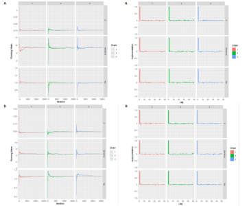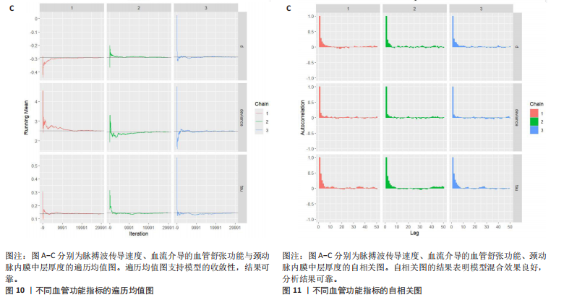与对照组比较,运动干预可以有效改善超重或肥胖儿童青少年脉搏波传导速度[SMD=-0.72,95%CI=(-1.19,-0.25),P < 0.05];亚组分析森林图显示,与对照组比较,高强度间歇训练可以有效改善超重或肥胖儿童青少年脉搏波传导速度[SMD=-1.13,95%CI(-1.76,-0.51),P < 0.05], 联合训练[SMD=-0.61,95%CI(-1.38,0.16),P > 0.05]、传统有氧训练[SMD=-1.23,95%CI(-2.77,0.30),P > 0.05]、抗阻训练[SMD=-0.05,95%CI(-0.69,0.59),P > 0.05]和混合训练[SMD=-0.30,95%CI(-0.79,0.19),P > 0.05]未能改善超重或肥胖儿童青少年脉搏波传导速度,见图7。综上来看,高强度间歇训练对超重或肥胖儿童青少年脉搏波传导速度改善效果明显,传统有氧训练、联合训练、混合训练、阻力训练的改善效果不大,该结果可能是文章数量过少导致的。 血流介导的血管舒张功能:5篇文献分析了运动干预对超重或肥胖儿童青少年肥胖血流介导的血管舒张功能的影响[35,41-44]。异质性检验(I2=59%,P=0.03)研究间异质性较高,采用随机效应模型。由于此次研究纳入单位不一致,故采用SMD标准化均数差进行合并效应量检验。整体合并效应量显示,与对照组比较,运动干预可有效改善超重或肥胖儿童青少年血流介导的血管舒张功能[SMD=0.93,95%CI(0.46,1.40),P < 0.05];亚组分析森林图发现,与对照组比较,高强度间歇训练[SMD=0.74,95%CI(0.15,1.34),P < 0.05]和传统有氧训练[SMD=1.37,95%CI(0.97,1.77),P < 0.05]可有效改善超重或肥胖儿童青少年血流介导的血管舒张功能,联合训练未能有效改善超重或肥胖儿童青少年血流介导的血管舒张功能[SMD=0.21,95%CI(-0.38,0.81),P > 0.05],见图8。综上来看,高强度间歇训练、传统有氧训练改善超重或肥胖儿童青少年血流介导的血管舒张功能的效果显著,而联合训练改善效果不佳,该结果可能是文章数量过少导致的。 颈动脉内膜中层厚度:7篇文献分析了运动干预超重或肥胖儿童青少年颈动脉内膜中层厚度的影响[35,38-40,42-43,45]。异质性检验(I2=0%,P=0.80)显示研究间异质性较低,采用固定效应模型。由于此次研究纳入单位不一致,故采用SMD标准化均数差进行合并效应量检验。整体合并效应量显示,与对照组比较,运动干预可有效改善超重或肥胖儿童青少年颈动脉内膜中层厚度[SMD=-0.28,95%CI(-0.48,-0.07),P < 0.05];通过亚组分析森林图发现,与对照组比较,高强度间歇训练可有效改善超重或肥胖儿童青少年颈动脉内膜中层厚度[SMD=-0.80,95%CI(-1.40,-0.20), P < 0.05],传统有氧训练[SMD=-0.18,95%CI(-0.52,0.15),P > 0.05]、联合训练[SMD=-0.25,95%CI(-0.71,0.21),P > 0.05]、混合训练[SMD=-0.25,95%CI(-0.68,0.19),P > 0.05]和抗阻训练[SMD=-0.14,95%CI(-0.78,0.49),P > 0.05]均未能有效改善超重或肥胖儿童青少年颈动脉内膜中层厚度,见图9。综上来看,高强度间歇训练对超重或肥胖儿童青少年颈动脉内膜中层厚度的改善效果显著,传统有氧训练、联合训练、混合训练、抗阻训练的改善效果不大,该结果可能是文章数量过少导致的。 2.4.3 遍历均值图 图10对应脉搏波传导速度、血流介导的血管舒张功能及颈动脉内膜中层厚度3个参数的收敛性分析,展示了各参数在迭代过程中的变化情况。结果显示各链的波动平稳且重叠良好,表明模型收敛性较好;迭代次数充足,参数在早期即达到稳定状态,未观察到明显的自相关性,进一步验证了模型的有效性。总体来看,遍历均值图支持模型的收敛性,结果可靠。 2.4.4 自相关图 图11展示了颈脉搏波传导速度、血流介导的血管舒张功"