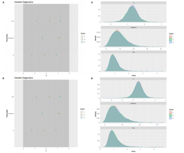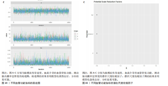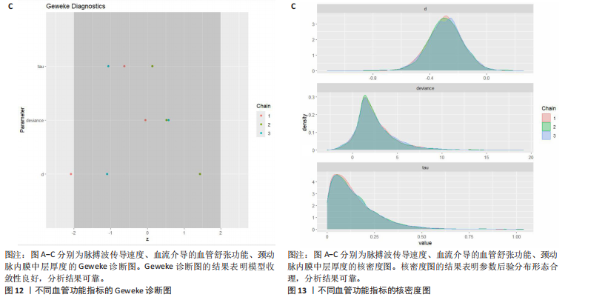 能、颈动脉内膜中层厚度参数在不同滞后阶数下的自相关性。结果显示,图中自相关系数在低滞后阶数(lag=1和lag=2)时迅速下降至接近零,表明马尔可夫链的混合效果较好,样本独立性较高;在滞后阶数达到10时,自相关系数已接近零,进一步支持模型的收敛性;未观察到自相关系数在高滞后阶数时显著高于零的情况,表明样本之间的相关性较低。总体来看,自相关图的结果表明模型混合效果良好,分析结果可靠。 2.4.5 Geweke诊断图 Geweke诊断图通过对比马尔可夫链早期与后期样本均值的差异来评估收敛性。图12中Z-score的分布集中在零附近且大部分落在[-1.96,1.96]的范围内,表明链的早期和后期均值无显著差异,支持模型收敛;未观察到明显的异常值或模式,进一步验证了模型的有效性。总体来看,Geweke诊断图的结果表明模型收敛性良好,分析结果可靠。 2.4.6 核密度图 核密度图的作用,即通过平滑曲线展示参数后验分布形态,用于直观反映参数的不确定性及其集中趋势。图13核密度图展示了参数后验分布的平滑曲线。结果显示图中曲线呈现单峰且近似对称形态,表明参数估计具有较高的确定性;曲线的尾部较短,进一步支持参数的不确定性范围较小;与先验分布相比,后验分布更为集中,表明数据对参数估计提供了较强的信息。总体来看,核密度图的结果表明参数后验分布形态合理,分析结果可靠。 2.4.7 踪迹图 踪迹图展示了马尔可夫链蒙特卡洛采样过程中参数的迭代值,用于诊断贝叶斯模型的收敛程度,当迭代次数不足时,马尔可夫链蒙特卡洛链未明显拟合,可识别出链的波动,收敛程度差,应增加迭代次数;当迭代次数达到7 000次时,各条马尔可夫链蒙特卡洛链从起始部分开始已达到稳定融合,并且在后续计算中重叠面积占链波动范围的大部分,并且不能识别单条链的波动,收敛程度满意。如图14所示,图中各链的波"