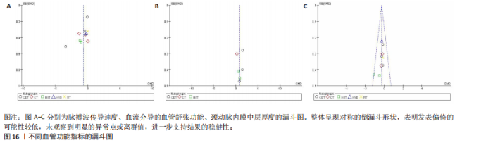 动平稳且无明显趋势,表明模型可能已经收敛;多条链在相同范围内波动且重叠良好,进一步支持模型的收敛性;迭代次数充足,参数在早期迭代后即趋于稳定;未观察到明显的异常模式,如周期性波动或突然跳跃。总体来看,踪迹图的结果表明模型收敛性良好,分析结果可靠。 2.4.8 潜在尺度收缩因子 潜在尺度收缩因子(R-hat)的作用,即通过比较链内和链间的方差来评估模型的收敛性。理想的潜在尺度收缩因子值通常小于1.1或1.05,这一范围广泛被认为是判断模型是否收敛的标准。图15中所有参数的潜在尺度收缩因子值均小于1.1,并且集中在1.0附近,表明模型收敛性良好;未观察到潜在尺度收缩因子值异常高的参数,进一步支持模型的有效性;多条链的潜在尺度收缩因子值一致性较高,表明各链之间的方差差异较小。总体来看,潜在尺度收缩因子图的结果表明模型收敛性良好,分析结果可靠。 2.4.9 漏斗图 漏斗图用于评估发表偏倚和小样本效应。图16为颈脉搏波传导速度、血流介导的血管舒张功能、颈动脉内膜中层厚度结局指标的漏斗图,图中大部分研究点集中在图形顶部,随着标准误差的减小,研究点逐渐向中间集中,整体呈现对称的倒漏斗形状,表明发表偏倚的可能性较低,未观察到明显的异常点或离群值,进一步支持结果的稳健性。"