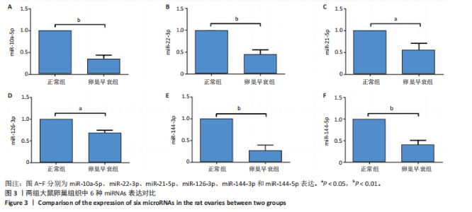 2.1 动物实验结果 2.1.1 实验动物数量分析 20只大鼠全部进入结果分析。 2.1.2 两组大鼠激素水平与卵巢形态比较 与正常组相比,卵巢早衰组大鼠血清雌二醇、抗缪勒管激素水平降低[雌二醇:(11.25±0.39),(5.70±0.19) pg/mL,P < 0.000 1;抗缪勒管激素:(758.53±82.31),(547.27± 53.13) ng/mL,P < 0.01),促卵泡生成素水平升高[(3.62±0.15),(5.90±0.72) mIU/mL,P < 0.01)],见图2A-C。 与正常组相比,卵巢早衰组大鼠卵巢体积减小,质量减少[(0.074±0.006),(0.031±0.005) g,P < 0.01],见图2D-F。苏木精-伊红染色结果显示卵巢早衰组大鼠卵泡数量少于正常组[(7.67±0.58),(3.33±1.16)个,P < 0.05)],见图2G,H。 2.1.3 两组大鼠卵巢组织中6种miRNAs表达比较 Q-PCR检测结果显示,卵巢早衰组大鼠卵巢组织中miR-10a-5p、miR-21-5p、miR-22-3p、miR-126-3p、miR-144-3p和miR-144-5p的表达均低于正常组(P < 0.05,P < 0.01),见图3。结果提示这些特定miRNAs的表达异常可能与卵巢早衰的病理过程密切相关。 2.2 临床样本检测结果 2.2.1 两组受试者血浆中激素水平比较 与健康对照组相比,卵巢早衰患者组血浆中促卵泡生成素水平升高(P < 0.05),雌二醇和抗缪勒管激素水平下降(P < 0.01),见表2。这一发现与卵巢早衰患者内分泌特征相符,进一步证实了促卵泡生成素、雌二醇和抗缪勒管激素在卵巢早衰诊断中的临床价值。 2.2.2 两组受试者血浆中6种miRNAs表达比较 Q-PCR检测结果显示,与健康对照组相比,卵巢早衰组受试者血浆中miR-10a-5p、miR-21-5p、miR-22-3p、miR-126-3p、miR-144-3p、miR-144-5p表"
