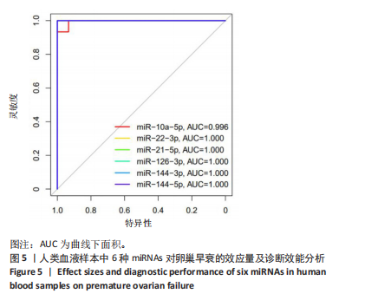 达均降低(P < 0.001,P < 0.000 1),见图4。提示这些miRNAs可能作为卵巢早衰的新型分子标志物,它们的表达异常与卵巢早衰病理机制存在潜在关联。 2.2.3 6种miRNAs的效应量及诊断效能分析结果 基于Q-PCR检测获得的2-ΔΔCt相对表达量数据,通过受试者工作特征曲线系统评估了各miRNA的诊断价值,见图5。受试者工作特征曲线分析显示,这6种miRNAs均展现出优异的诊断区分能力,其中miR-10a-5p(AUC=0.996,95%CI:0.989-1.000)具有近乎完美的诊断效能,而miR-22-3p、miR-21-5p、miR-126-3p、miR-144-3p和miR-144-5p则达到理论最佳诊断性能(AUC=1.000,95%CI:1.000-1.000)。这些结果从计量诊断学角度证实,此次研究所检测"