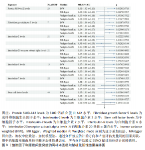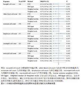 2.1 白细胞与腰椎间盘突出症的因果关系 在剔除连锁不平衡和弱工具变量后,将6种白细胞分别作为暴露,腰椎间盘突出症作为结局,共筛选出188个与嗜碱性粒细胞相关的单核苷酸多态性、463个与白细胞相关的单核苷酸多态性、476个与单核细胞相关的单核苷酸多态性、471个与淋巴细胞相关的单核苷酸多态性、423个与嗜酸性粒细胞相关的单核苷酸多态性、395个与绝对中性粒细胞相关的单核苷酸多态性。孟德尔随机化结果表明循环系统中的嗜碱性粒细胞和嗜酸性粒细胞与腰椎间盘突出症具有因果关系(逆方差加权法:P=0.025,OR=0.93,95%CI:0.87-0.99;加权中位数法:P=0.042,OR=0.94,95%CI:0.88-1.00),其余4种白细胞与腰椎间盘突出症风险均不具有显著因果关系(P > 0.05)(图2)。 2.2 细胞因子与腰椎间盘突出症的因果关系 在剔除连锁不平衡和弱工具变量后,将91种细胞因子分别作为暴露,腰椎间盘突出症作为结局,共筛选出6种在遗传学上可能与腰椎间盘突出症存在关系的蛋白。其中,S100钙结合蛋白A12水平(逆方差加权法:P < 0.05,OR=1.08,95%CI:1.02- 1.13)、成纤维细胞生长因子水平(逆方差加权法:P < 0.05,OR=1.03,95%CI:1.00-1.07)、白细胞介素20受体α蛋白水平(逆方差加权法:P < 0.05,OR=1.09,95%CI:1.04-1.15)、白细胞介素6水平(逆方差加权法:P < 0.05,OR=1.07,95%CI:1.00-1.13)、白细胞介素7水平(逆方差加权法:P < 0.05,OR=1.08,95%CI:1.01-1.16)、干细胞因子水平(逆方差加权法:P < 0.05,OR=1.05,95%CI:1.01-1.09)与腰椎间盘突出症呈正相关因果关系,而白细胞介素2水平(逆方差加权法:P < 0.05,OR=0.94,95%CI:0.89-0.99)与腰椎间盘突出症呈负相关因果关系(图3-5)。该研究同时采用MR?Egger"