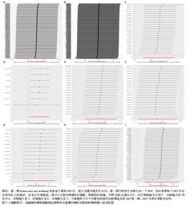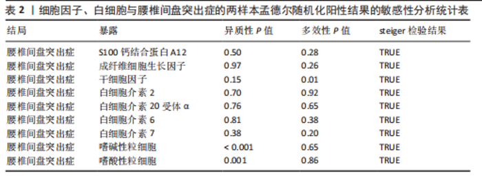 分析、加权中位数和加权众数法分析的结果均与逆方差加权法一致,表明因果关系可靠。 2.3 反向孟德尔随机化分析 在反向孟德尔随机化分析中,在腰椎间盘突出症作为暴露的情况下,并未发现任何阳性结局的细胞因子和白细胞。 2.4 共定位分析结果 全基因组关联研究共定位分析结果显示,干细胞因子水平H3+H4=0.80,其中H3=0.09,H4=0.71,S100钙结合蛋白A12水平H3+H4=0.02,成纤维细胞生长因子水平H3+H4=0.09,白细胞介素20受体α蛋白水平H3+H4=0.08,白细胞介素2水平H3+H4=0.02,白细胞介素6水平H3+H4=0.07,白细胞介素7水平H3+H4=0.02。以上几个阳性结果中,仅有干细胞因子水平在共定位中有显著意义(图6)。干细胞因子水平和腰椎间盘突出症的共定位结果中,H4=0.71,表明干细胞因子水平与腰椎间盘突出症在此区域内的单核苷酸多态性位点显著相关,并且是相同因果变异位点。共定位分析测得的最显著的单核苷酸多态性为rs6073966。 2.5 敏感性分析结果 为增强结果的稳定性,在此研究中还对结果进行了敏感性分析。MR-Egger截距检验表明除干细胞因子水平外的阳性结果不存在水平多效性(P > 0.05)(表2)。经Cochran’s Q检验,全部细胞因子阳性结果P值均≥0.05,说明无异质性。Steiger检验结果P值均 < 0.05为TRUE,说明阳性暴露对结果均为单向阳性作用,这一点和双向孟德尔随机化结果相互印证。留一法未显示异常,说明不存在偏移的单核苷酸多态性。敏感性分析肯定了结果的稳定性和可靠性(图7)。"
