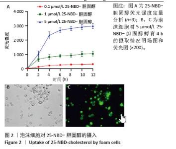 2.2 泡沫细胞对25-NBD-胆固醇的摄入 不同浓度25-NBD-胆固醇孵育液(0.1,1,5 μmol/L)孵育泡沫细胞不同时间(0,2,4,6,8,10,12 h),使用荧光酶标仪检测细胞裂解液的荧光强度,定量分析细胞对不同浓度25-NBD-胆固醇摄入情况(图2A),在相同时间点5 μmol/L组较0.1 μmol/L和1 μmol/L组荧光强度明显升高,泡沫细胞对胆固醇的摄入呈浓度依赖性。25-NBD-胆固醇摄入在孵育4 h时达到平台期。5 μmol/L 25-NBD-胆固醇孵育泡沫细胞4 h荧光强度为2 516.67±117.85,在荧光显微镜下观察荧光标记胆固醇(5 μmol/L 25-NBD-胆固醇)孵育泡沫细胞4 h的摄取情况(图2B和图2C),选择此实验条件用于后续胆固醇流出实验。"