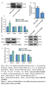 2.6 PCSK9 siRNA对胆固醇转运蛋白表达的影响 用PCSK9 siRNA转染THP-1单核细胞源巨噬细胞,检测PCSK9蛋白表达,结果显示,PCSK9 siRNA转染组的PCSK9蛋白表达低于阴性对照组(非靶向siRNA转染巨噬细胞)(0.50±0.04 vs. 1.00±0.11,图6A,B,P < 0.01)。然后,将巨噬细胞诱导成泡沫细胞,检测TRAK2、ABCA1、ABCG1、SR-BI的表达。PCSK9 siRNA转染组ABCA1 mRNA与蛋白表达高于阴性对照组(非靶向siRNA转染泡沫细胞),分别为1.79±0.30 vs. 1.00±0.07和1.56±0.05 vs. 1.00±0.05,见图6C-E,P均< 0.001,TRAK2 mRNA与蛋白表达低于阴性对照组,分别为0.40±0.03 vs. 1.01±0.17和0.62±0.06 vs. 1.00±0.10,见图6C-E,P < 0.001和P < 0.05,但对ABCG1和SR-BI表达无显著影响,见图6C-E。"