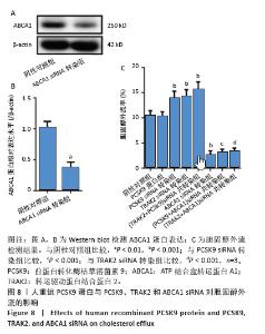 2.8 人重组PCSK9蛋白与PCSK9、TRAK2和ABCA1 siRNA对胆固醇外流的影响 ABCA1 siRNA转染THP-1单核细胞源性巨噬细胞,结果显示,ABCA1 siRNA转染组ABCA1蛋白表达低于阴性对照组(非靶向siRNA转染巨噬细胞)(0.37±0.08 vs. 1.02±0.08,P < 0.01),见图8A,B。胆固醇外流率分析如图8C所示,PCSK9 siRNA转染组、TRAK2 siRNA转染组、(PCSK9+TRAK2) siRNA共转染组胆固醇外流率均高于阴性对照组(非靶向siRNA转染泡沫细胞),分别为(13.80±1.40)%,(14.20±1.31)%,(15.54±1.54)% vs. (10.40±0.97)%,P均< 0.001。ABCA1 siRNA转染组胆固醇外流率低于阴性对照组(2.56±0.86)% vs. (10.40±0.97)%,P < 0.001。(PCSK9+ABCA1) siRNA共转染组胆固醇外流率低于PCSK9 siRNA转染组(3.06±0.70)% vs. (13.80±1.40)%,P < 0.001。(TRAK2+ABCA1) siRNA共转染组胆固醇外流率低于TRAK2 siRNA转染组(3.31±0.66)% vs. (14.20±1.31)%,P < 0.001。人重组PCSK9蛋白对胆固醇外流无明显影响。PCSK9与TRAK2 siRNA共转染相比于PCSK9或TRAK2 siRNA单独转染,胆固醇外流没有显著差异。PCSK9或TRAK2与ABCA1 siRNA共转染相比于ABCA1 siRNA单独转染,胆固醇外流没有显著有差异。 "