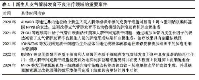 RESULTS AND CONCLUSION: (1) Mesenchymal stem cells and their extracellular vesicles can mediate various therapeutic mechanisms, including alleviating oxidative stress response, promoting angiogenesis and vascular repair, inhibiting pulmonary fibrosis process, anti-apoptosis, regulating cell autophagy, and participating in immune regulation and inflammation inhibition. Mesenchymal stem cells and their extracellular vesicles have shown good application prospects in the prevention and treatment of neonatal bronchopulmonary dysplasia, and are expected to become one of the important treatment strategies for this disease. (2) Under traditional administration methods, mesenchymal stem cells and their extracellular vesicles are difficult to achieve long-term retention in the lungs, thereby limiting their ability to sustain repair of damaged tissues. In recent years, the introduction of engineering biomaterials such as hydrogels has provided a new solution to this problem. Hydrogel can not only realize the slow release of exosomes in the lung tissue, but also protect them from the influence of the inflammatory microenvironment in the lung to a certain extent, thus improving their biological stability and therapeutic efficacy. Therefore, the hydrogel-based stem cell and exocrine delivery system is expected to become a hot research direction in the treatment of neonatal bronchopulmonary dysplasia in the future.